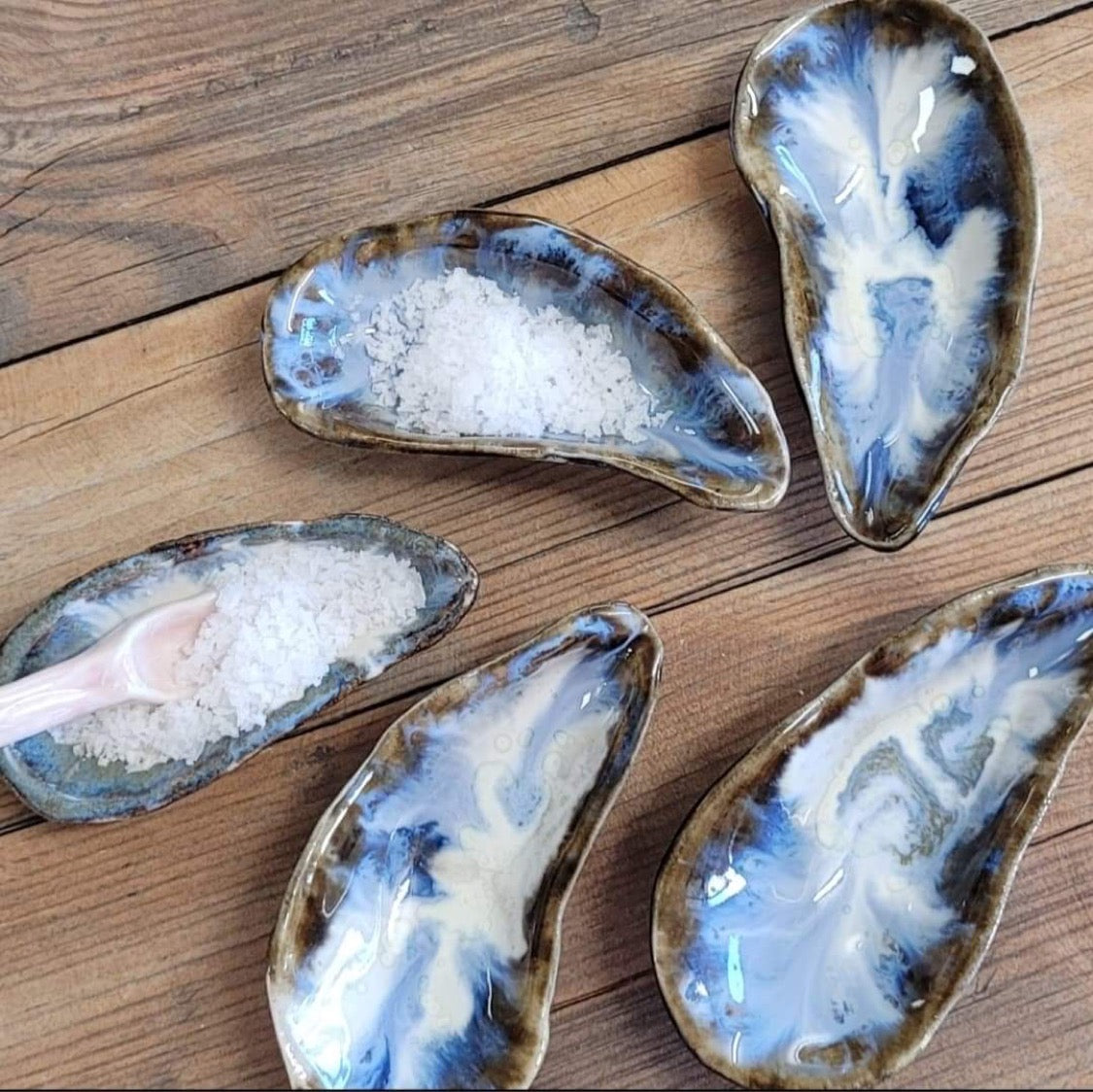 Blåskjell med miniskje av keramikk. Fine til bordsalt eller annet smått til servering.