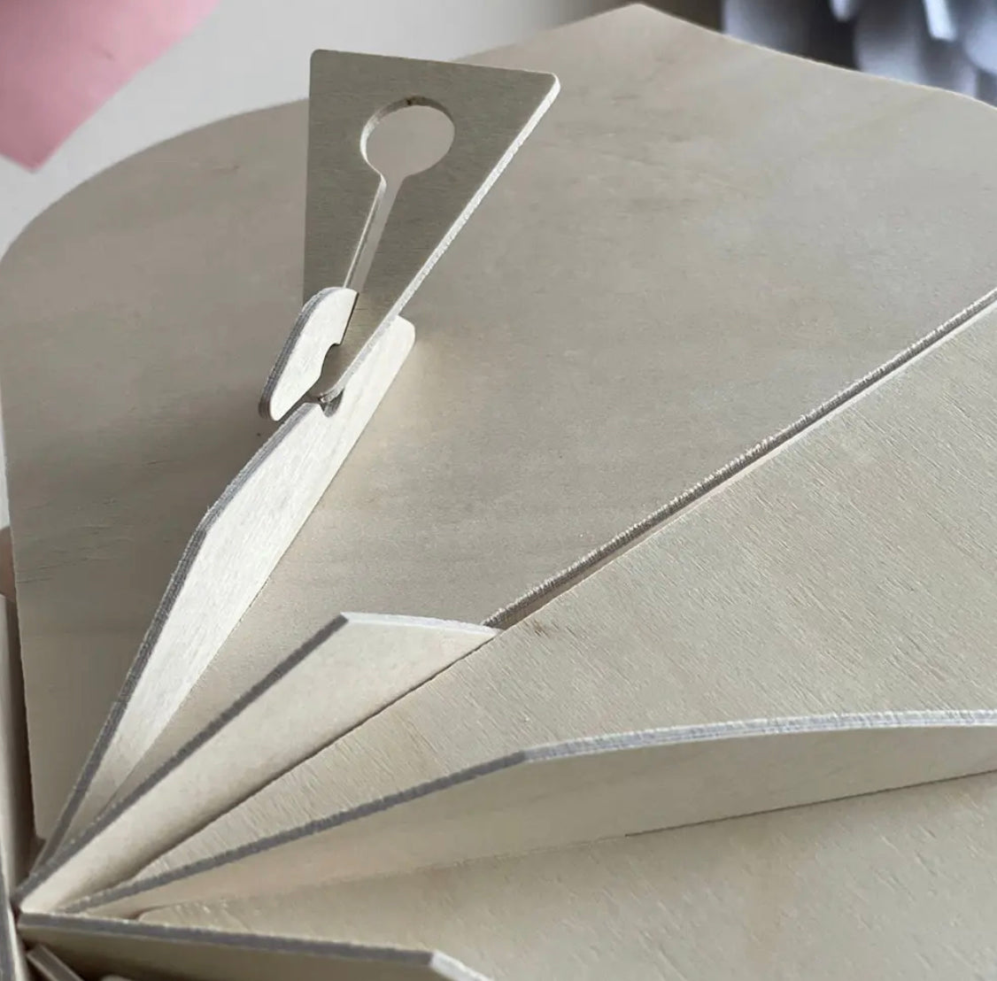 15 cm, blomst med oppheng til å bygge selv. Kommer flatpakket, delene presses ut av tynne bjørnefinérplater.