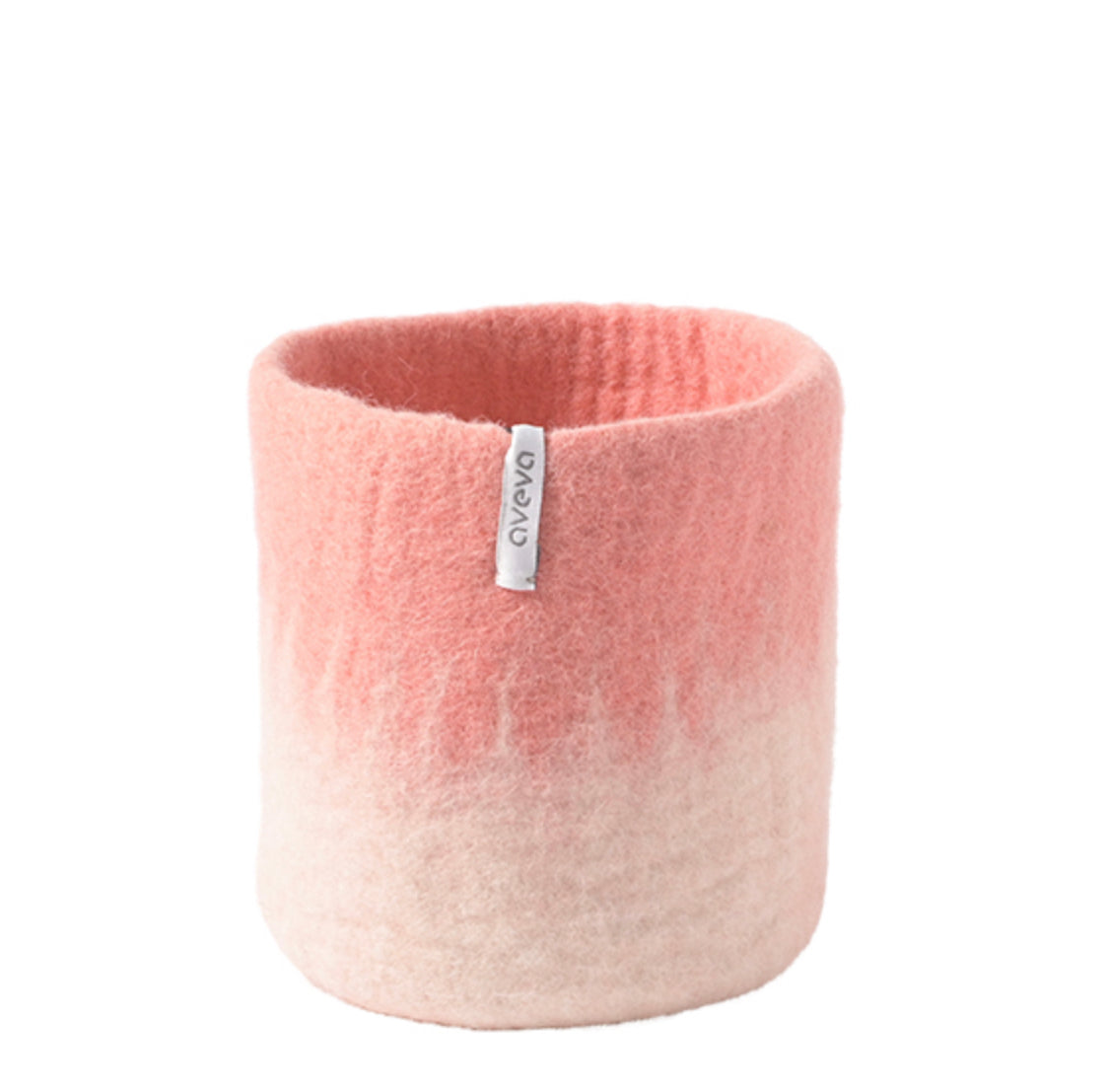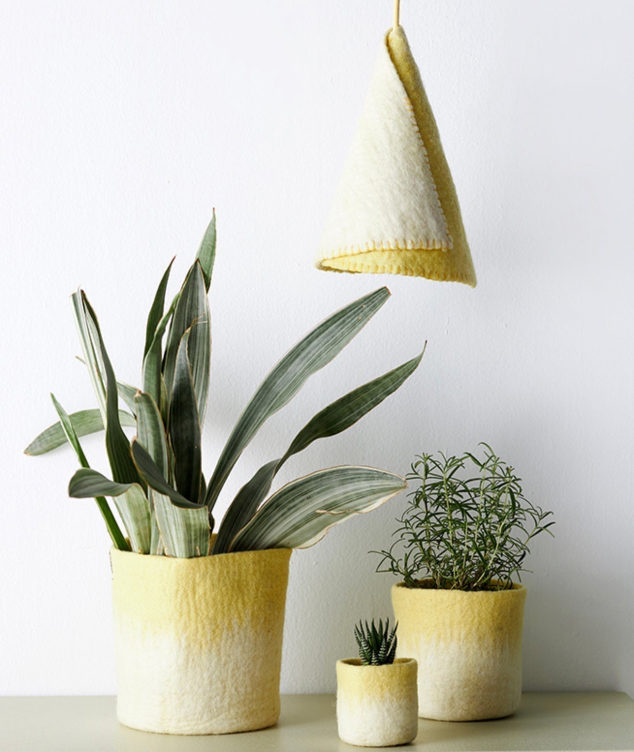 Blomsterpotte i tovet ull. Innsiden er behandlet med naturgummi, som gjør potten vanntett. Kan også brukes til oppbevaring av andre ting og tang.