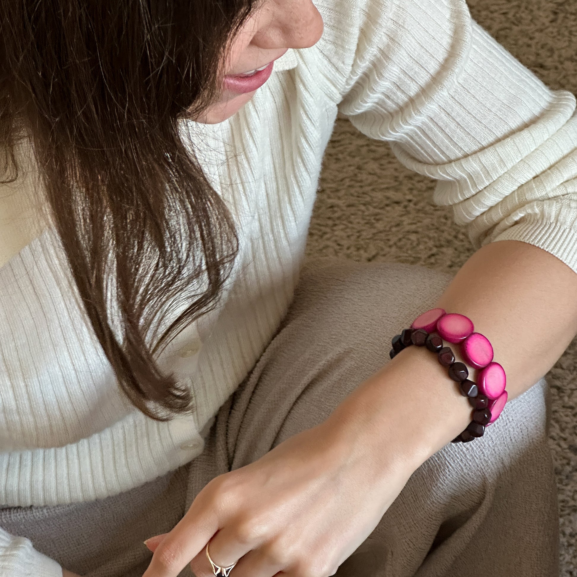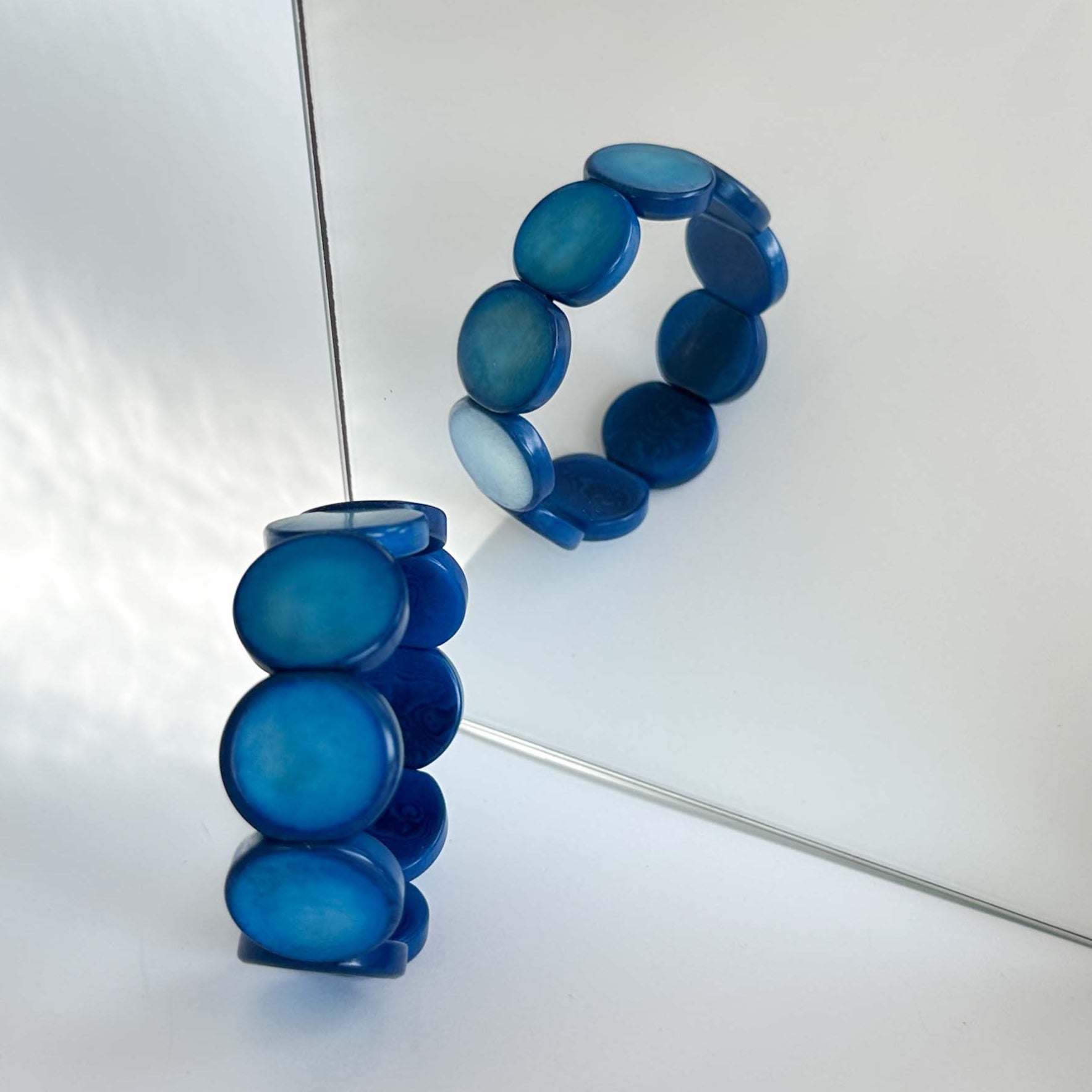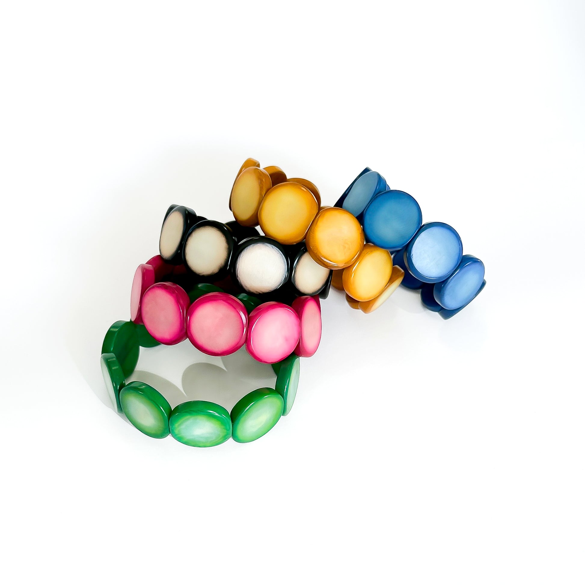 Eclipse-armbåndet er tilgjengelig i en kuratert palett av livlige fargetoner, og passer vakkert sammen med Eclipse Tagua-øredobber for et slående og bærekraftig sett.