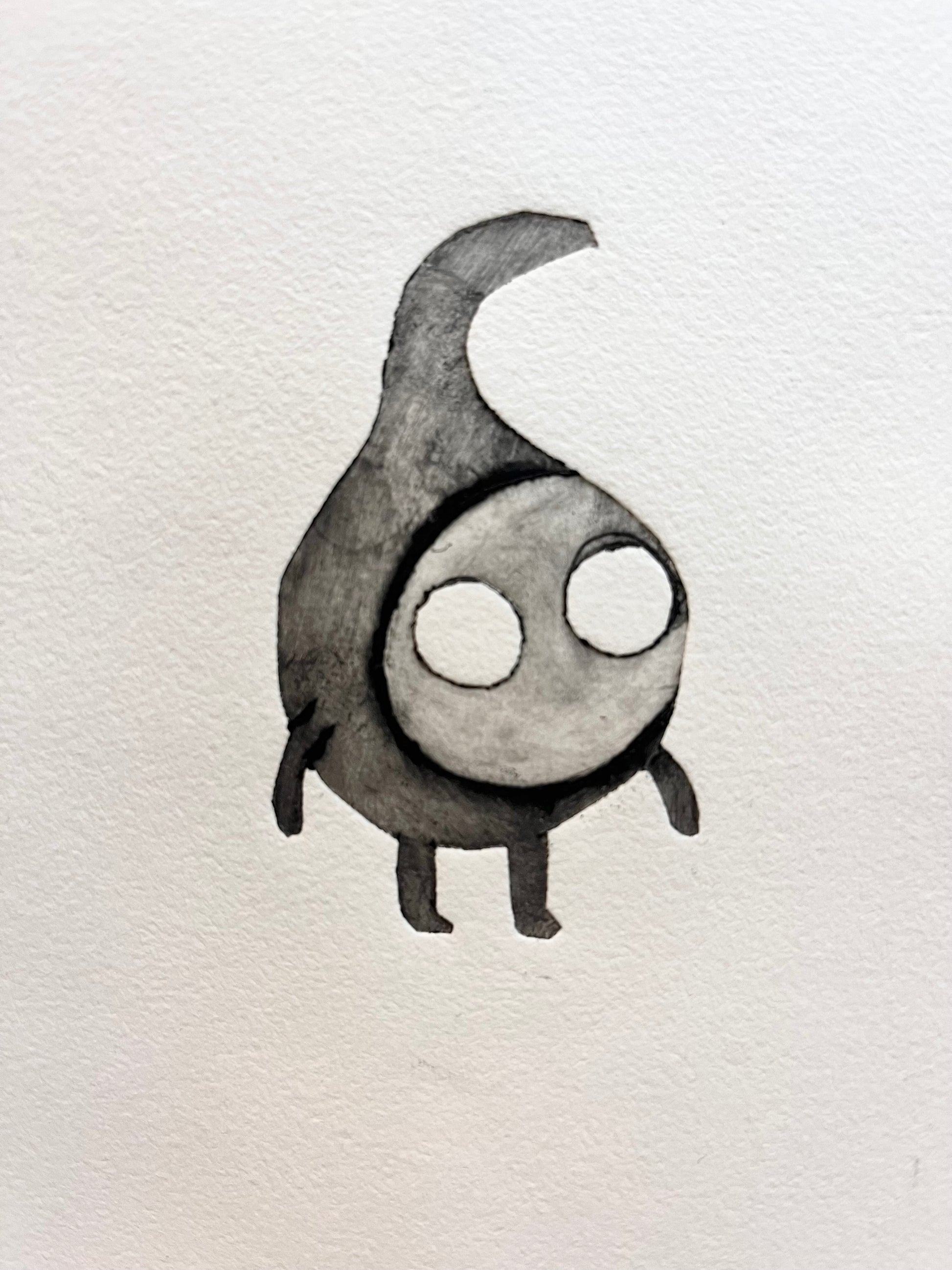 Motivet er skåret ut av materialet tetrapak, som man bla. a. finner i juskartong. Teknikken gjør at det oppstår mange tilfeldigheter i motivet fra skjøter og merker i kartongen. Figuren trykket gir også et relieff i papiret.
