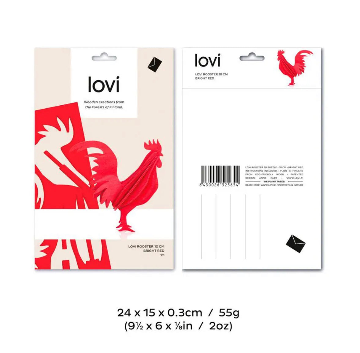 Produsert i Finland. Plastikkfri. Lett å sende postkort-størrelse. Illustrerte byggeinstruksjoner på innsiden. Patentert av Lovi Finland.