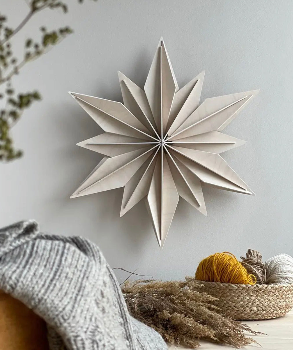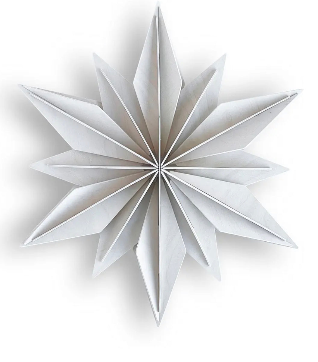 24 cm, stjerne med oppheng til å bygge selv. Kommer flatpakket, delene presses ut av tynne bjørnefinérplater.