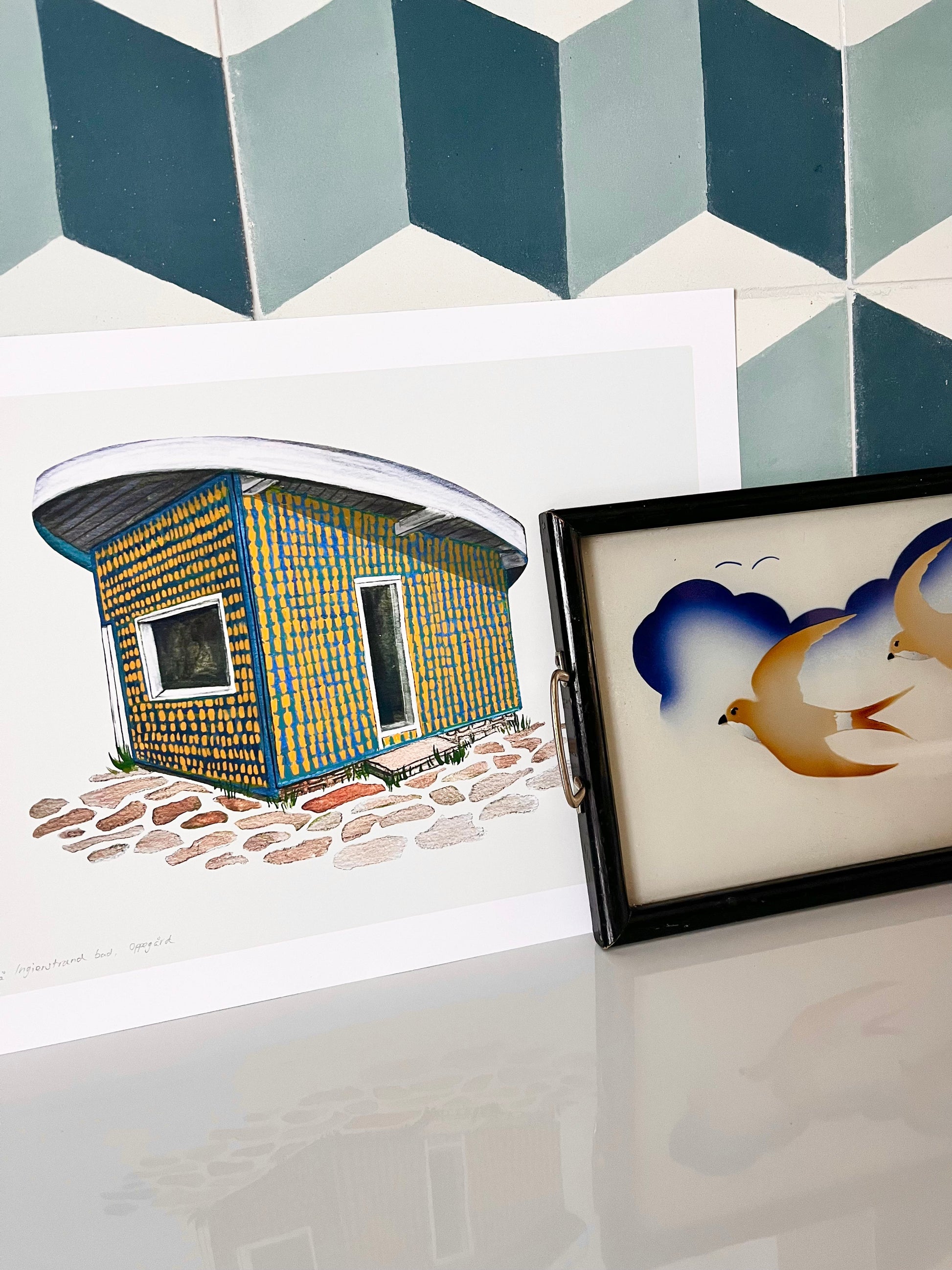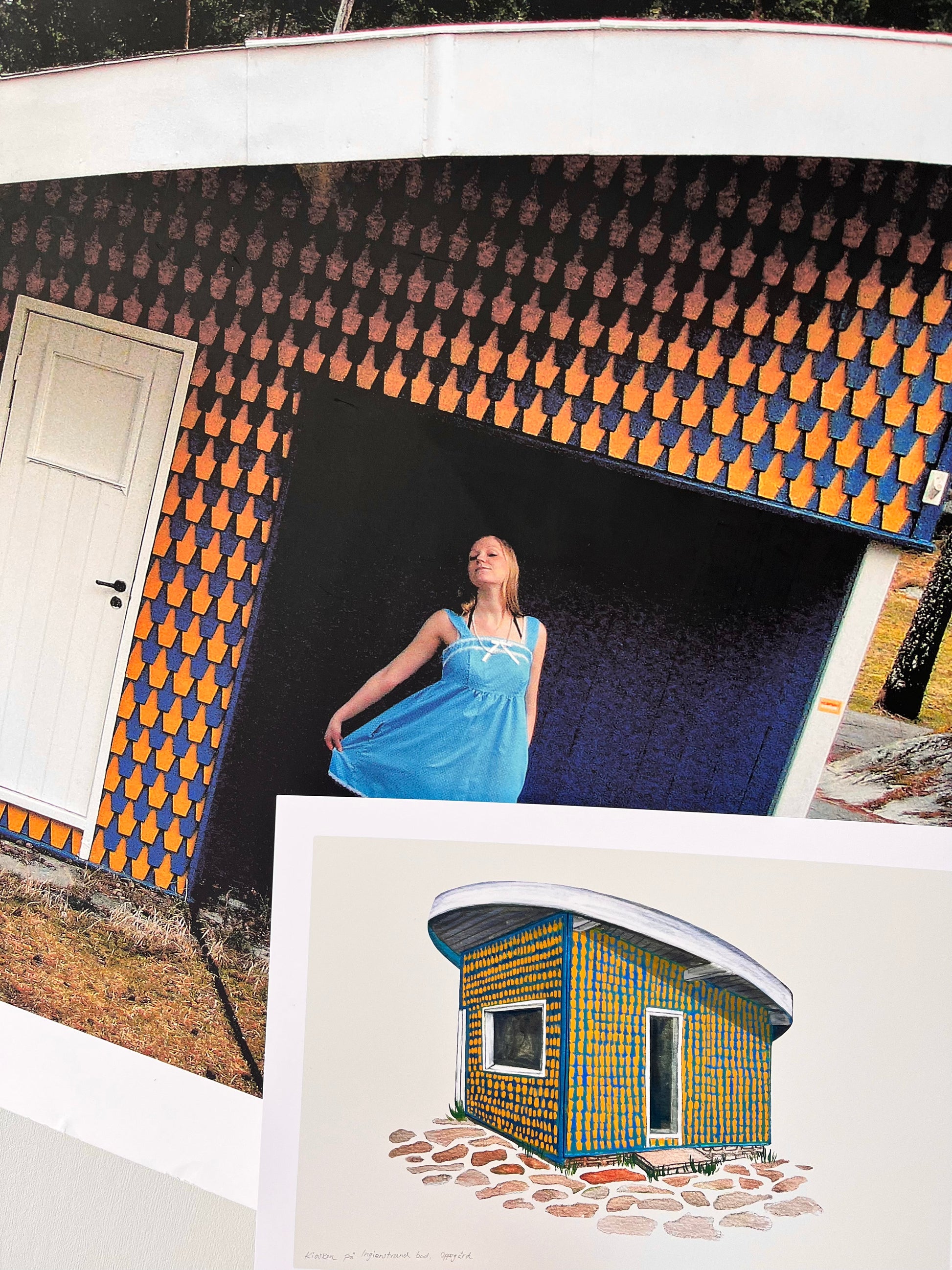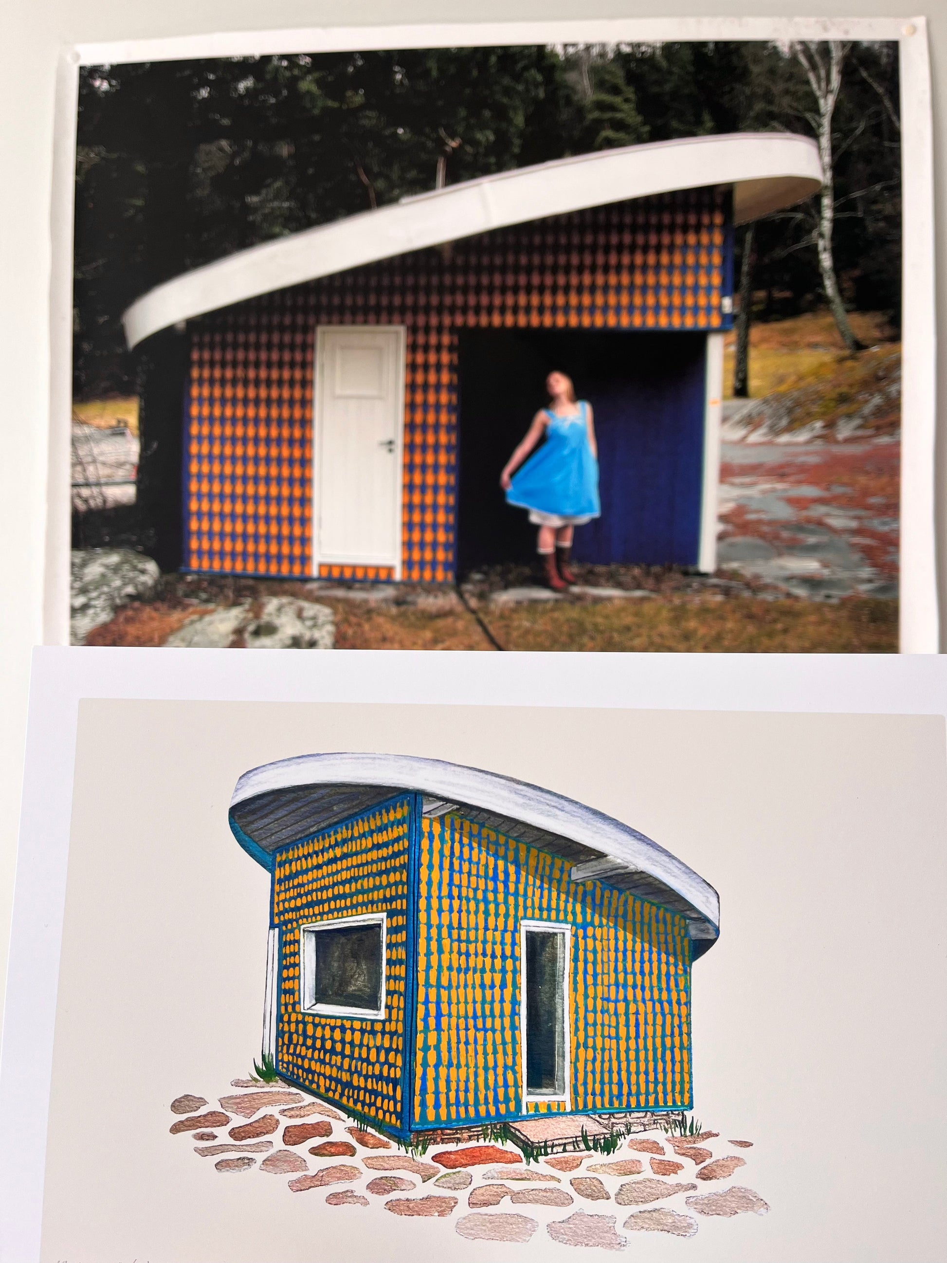 illustrasjon av kiosken på Ingierstrand bad i Oppegård (1934) malt med gouache, scannet inn og bearbeidet digitalt. Kommer med en hvit kant rundt motivet.