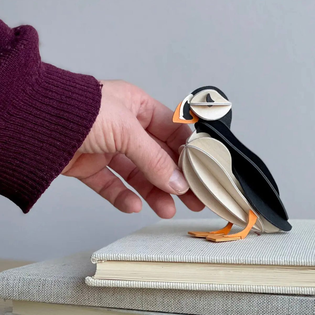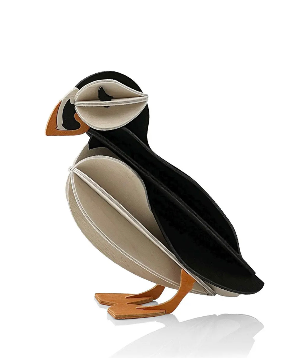 10 cm høy, lundefugl til å bygge selv. Kommer flatpakket, delene presses ut av tynne bjørnefinérplater.