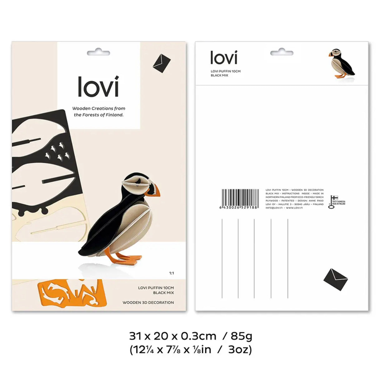 Produsert i Finland. Plastikkfri. Lett å sende. Illustrerte byggeinstruksjoner på innsiden. Patentert av Lovi Finland.