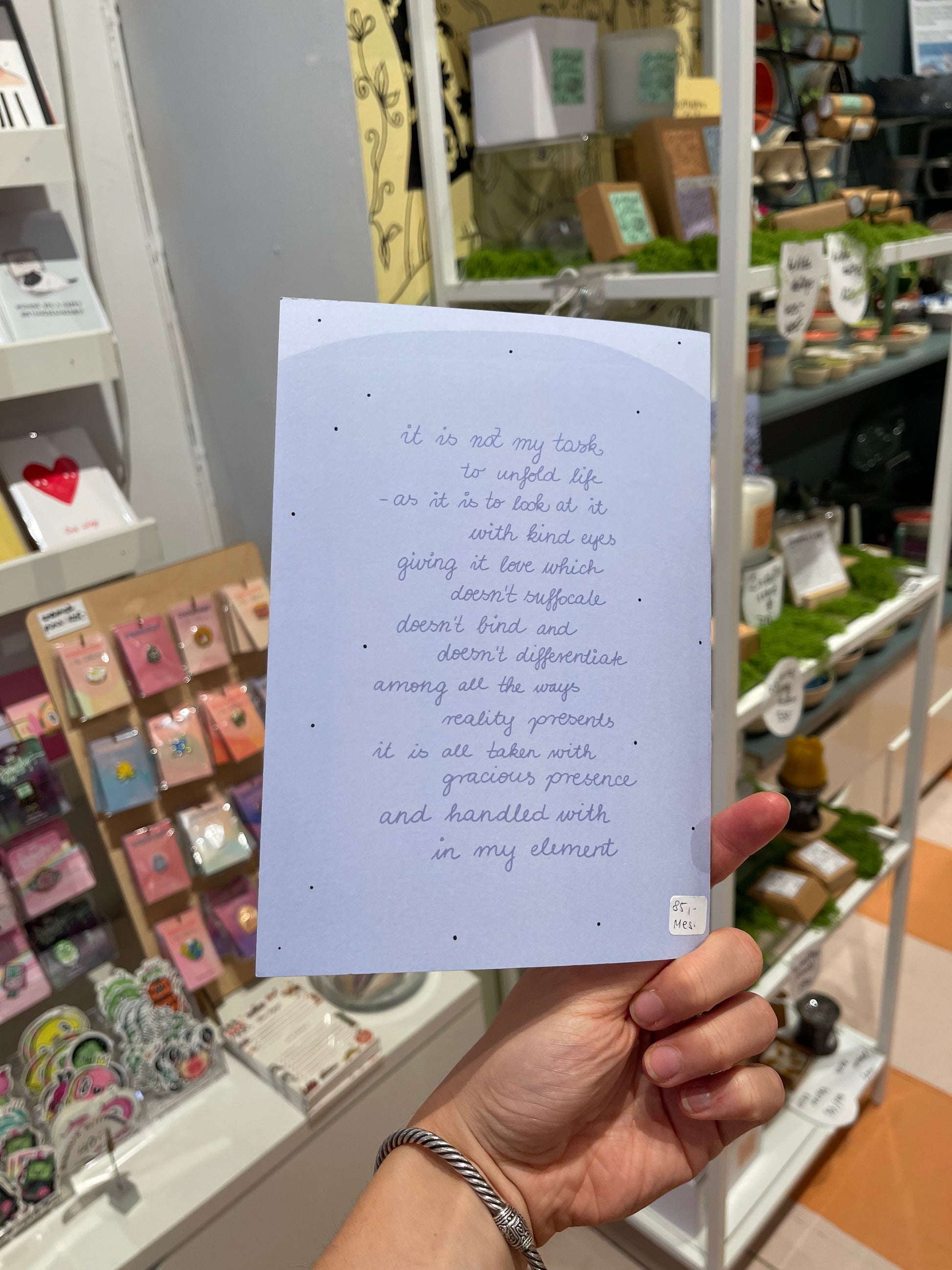 På baksiden finner du et poem skrevet av Mesi, som inviterer til indre ro.