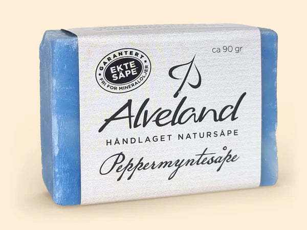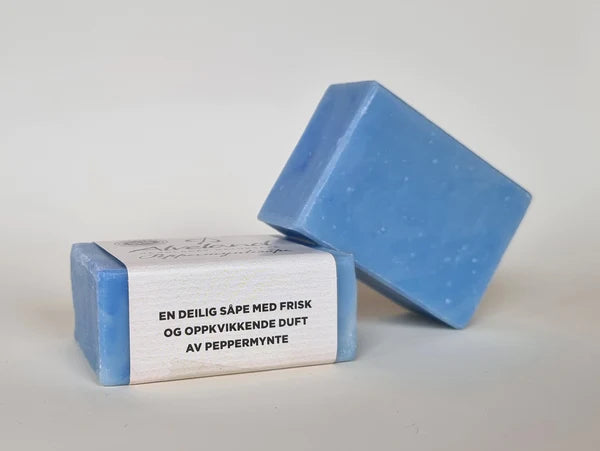 Peppermyntesåpen er laget med olivenolje, kokosolje, mandelolje, sheasmør, kakaosmør, eterisk olje av peppermynte, ultramarint fargepigment og rosmarinekstrakt. Laget og skåret for hånd på Dverberg i Andøy. Såpen inneholder ingen kunstige konserveringsmidler.