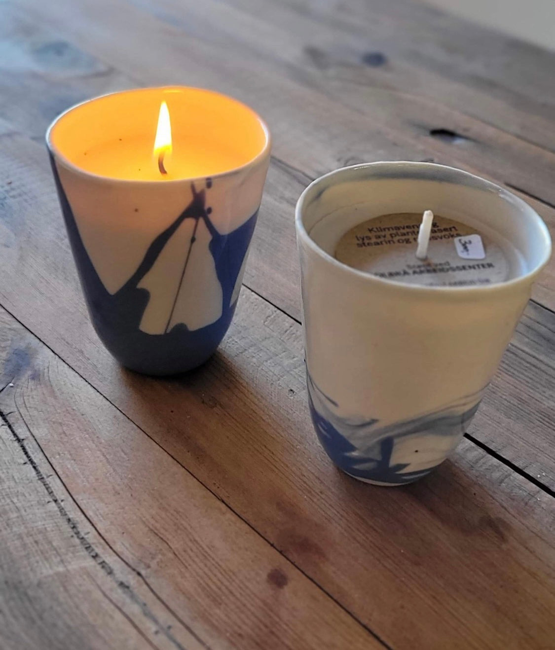 Porselenskopp med støpt lys. Lysene brenner pent og helt ned, og porselenskoppen kan gjenbrukes som f.eks. kopp, vase eller telysestake.
