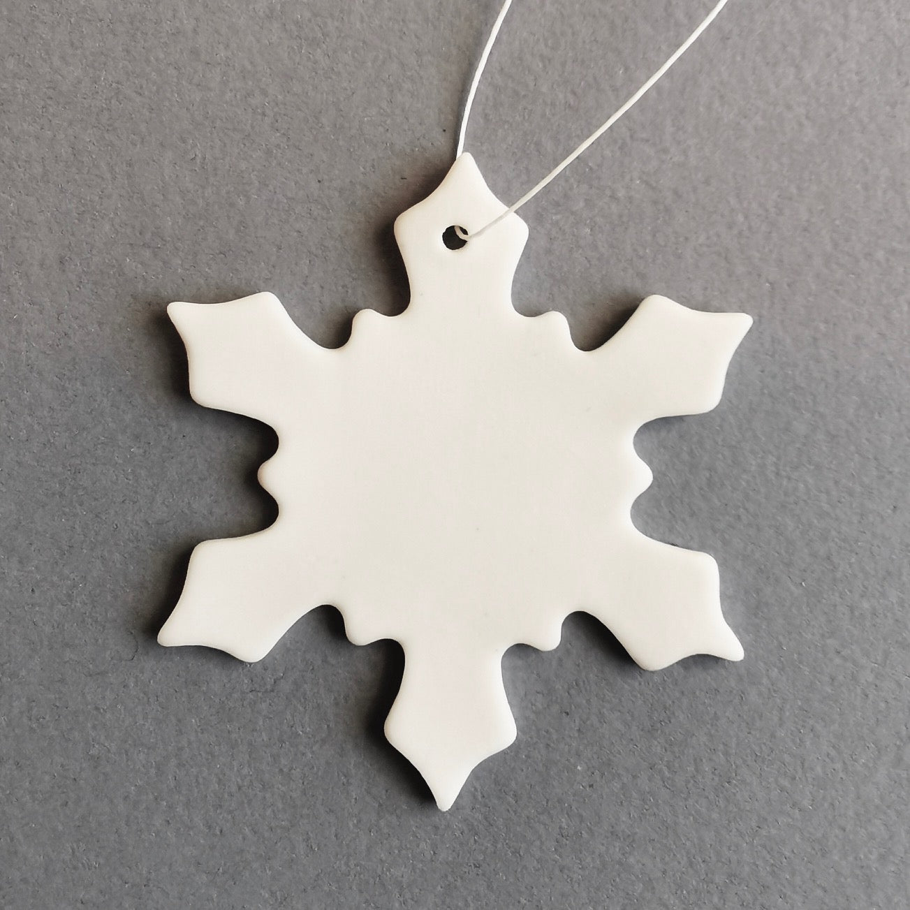 Porselenspynt med snøfnugg til å henge på juletreet, i vinduet eller kanskje på julegava?
