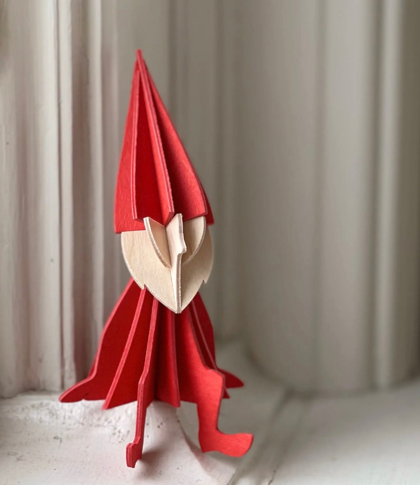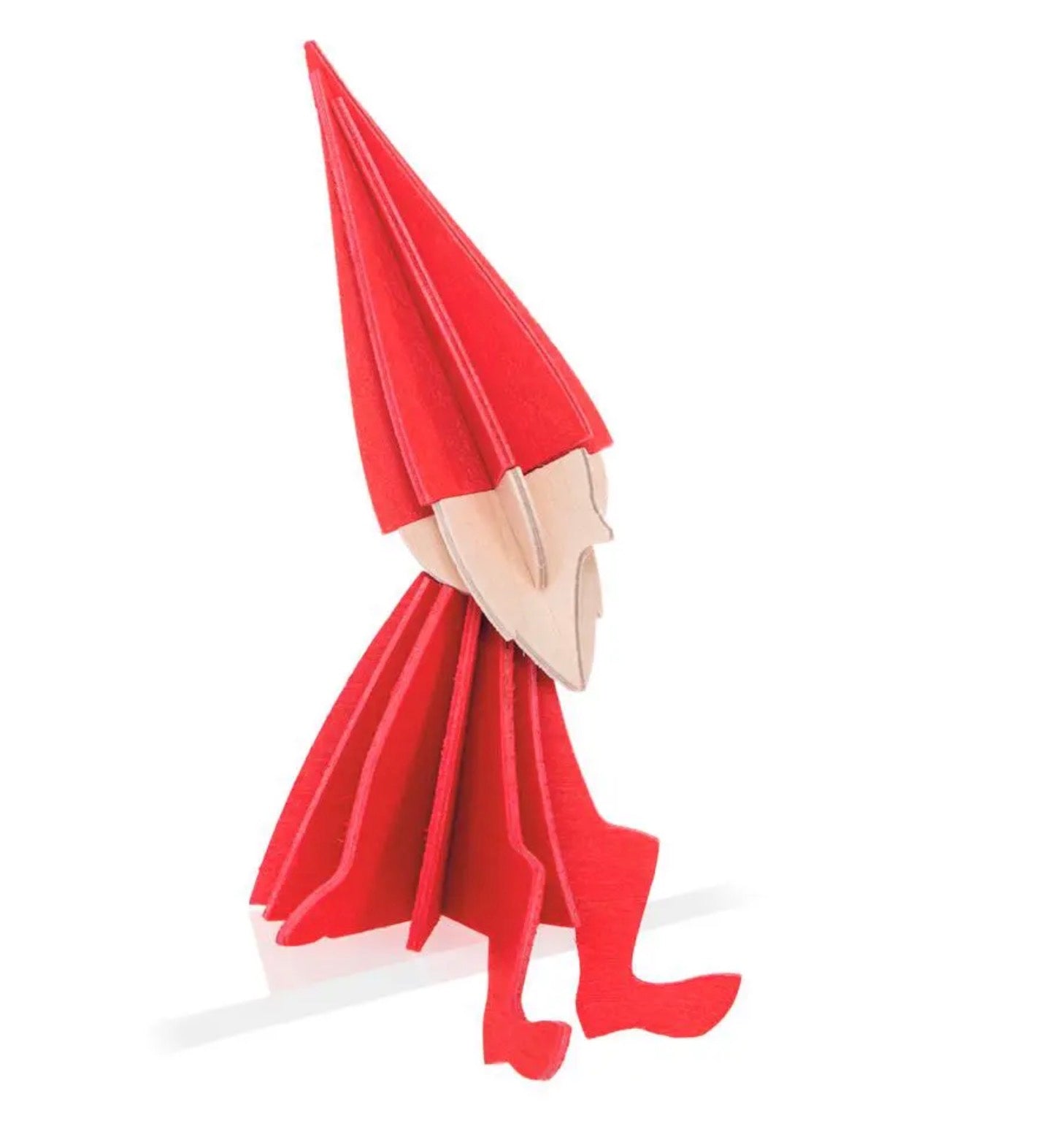 16 cm høy, sittende liten nisse til å bygge selv. Kommer flatpakket, delene presses ut av tynne bjørnefinérplater.