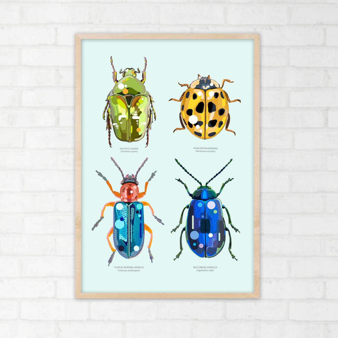Trykk med digitale illustrasjoner av 4 ulike biller som lever i Norge: