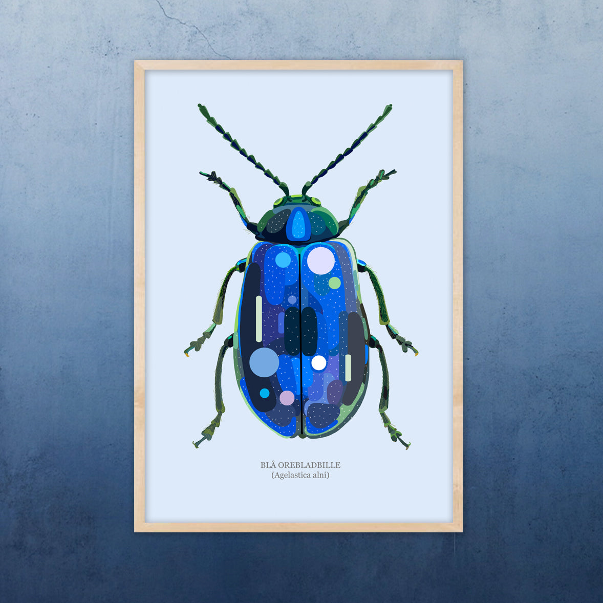 Digital illustrasjon av blå orebladbille. Blå orebladbille (Agelastica alni) er en bille som tilhører familiegruppen bladbiller. Den lever særlig på gråor. Den er utbredt i det meste av Europa, og den er en av de vanligste bladbillene i Norge.
