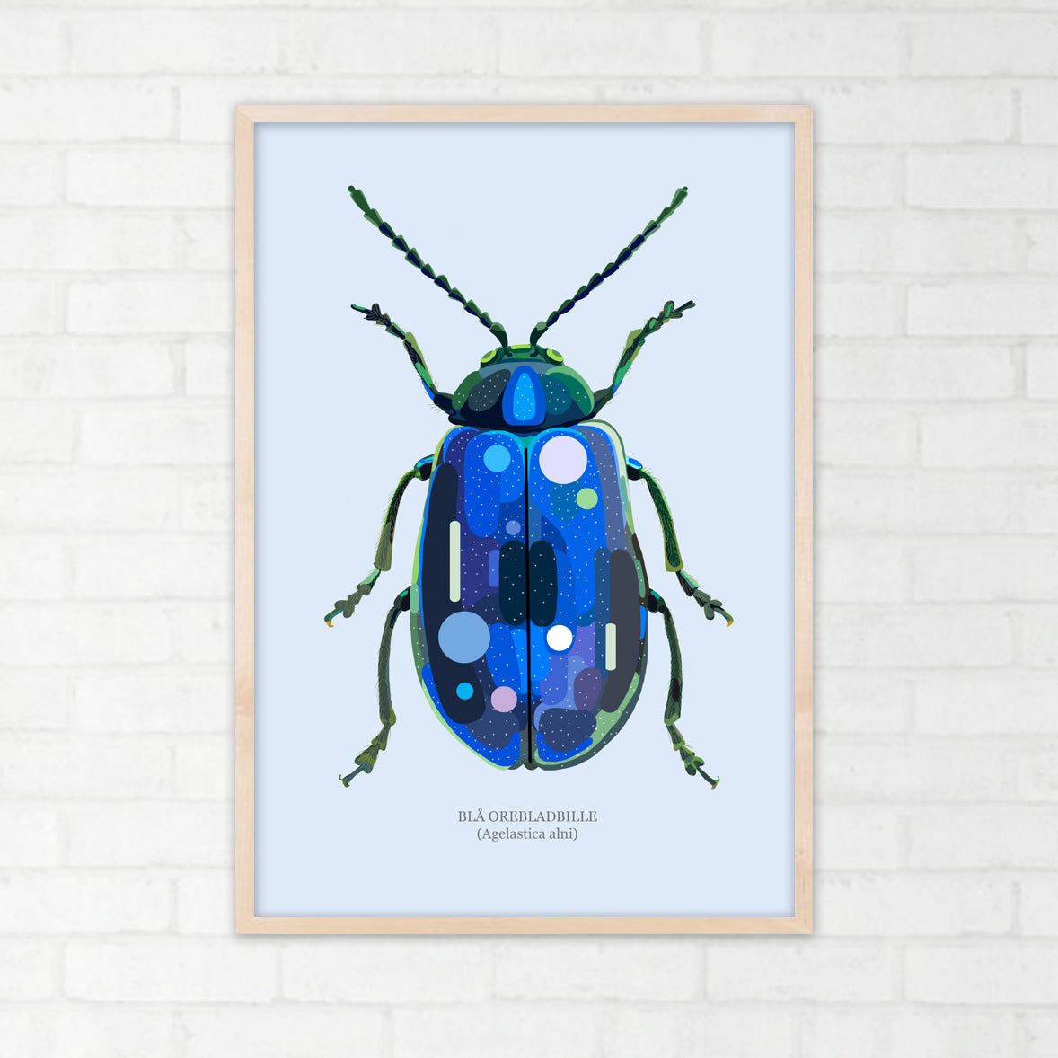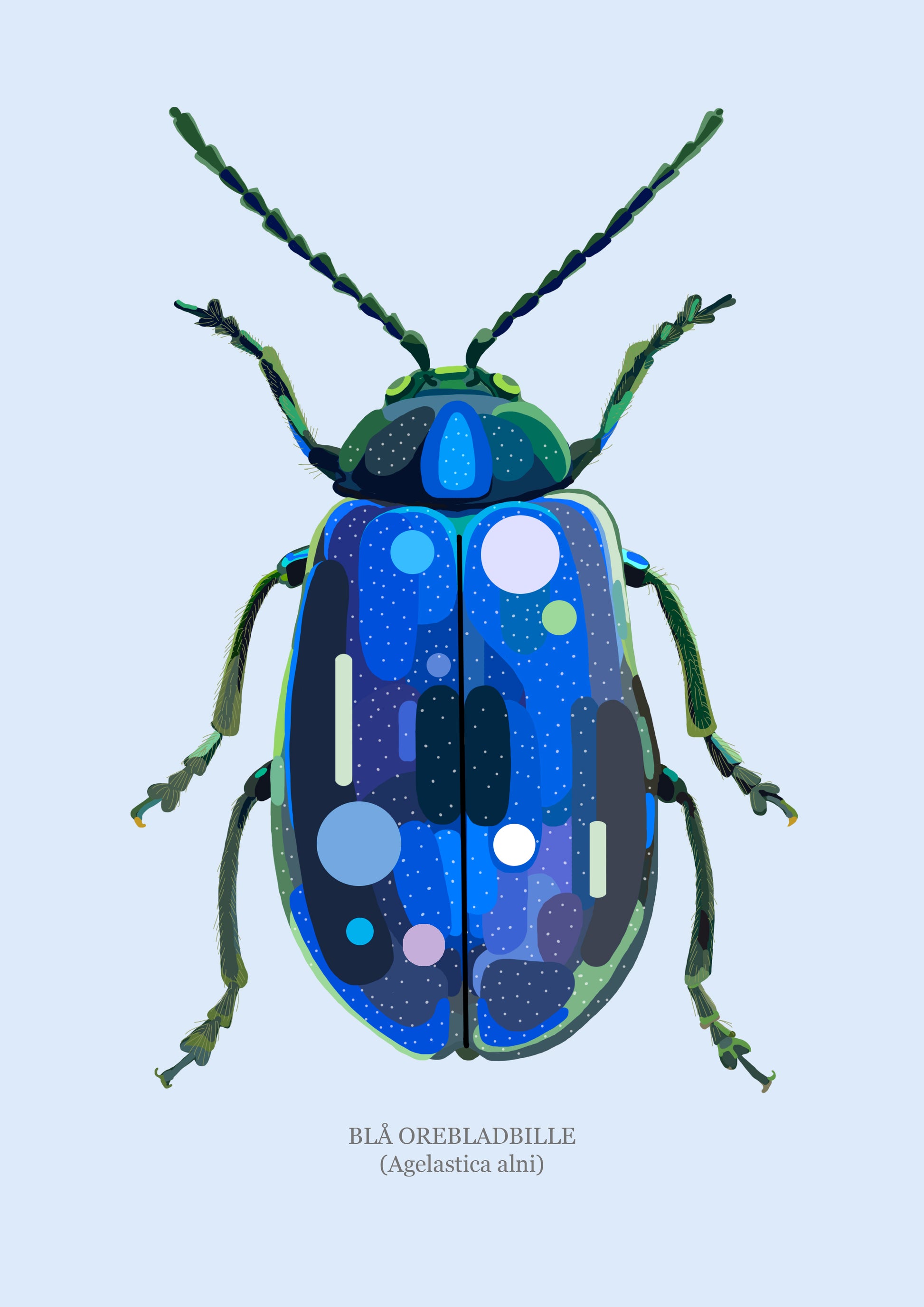 Digital illustrasjon av blå orebladbille. Blå orebladbille (Agelastica alni) er en bille som tilhører familiegruppen bladbiller. Den lever særlig på gråor. Den er utbredt i det meste av Europa, og den er en av de vanlig bladbillene i Norge.