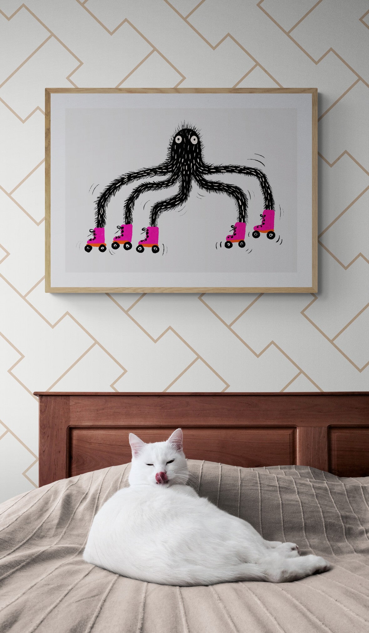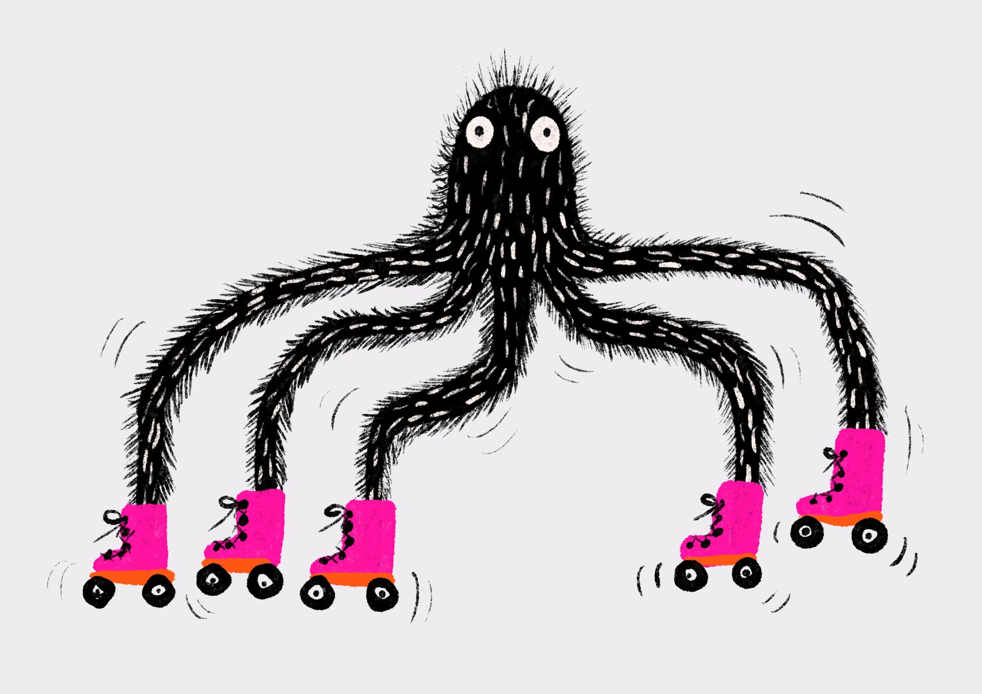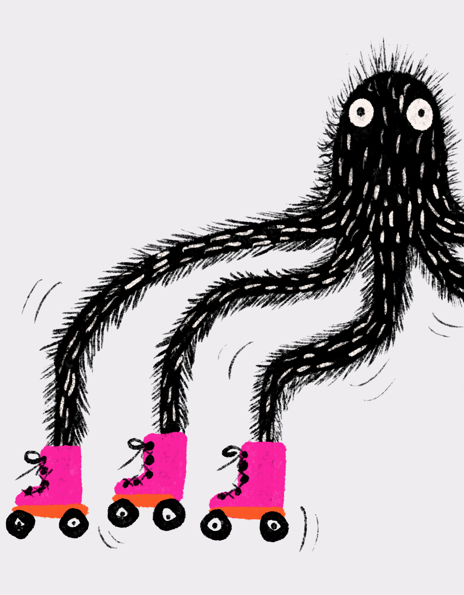 Hårete vesen med rulleskøyter, digital illustrasjon.