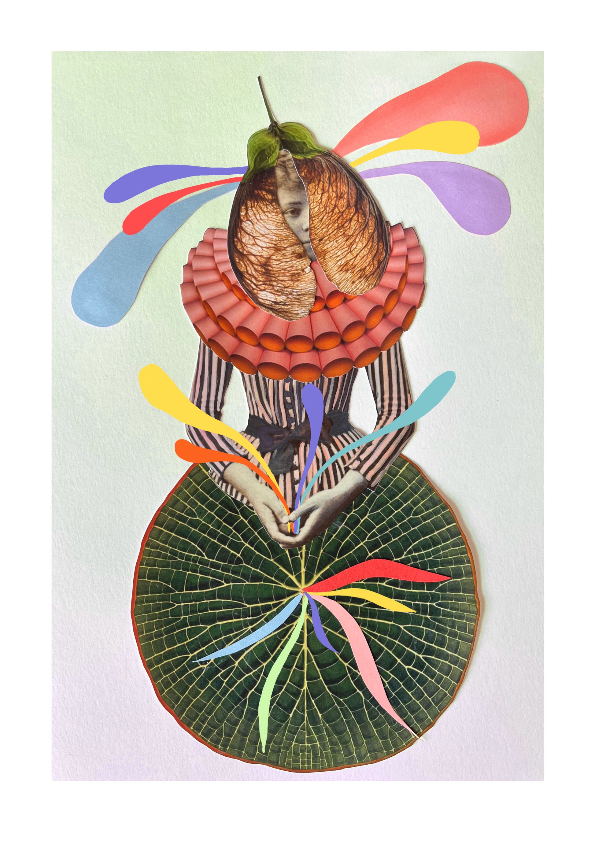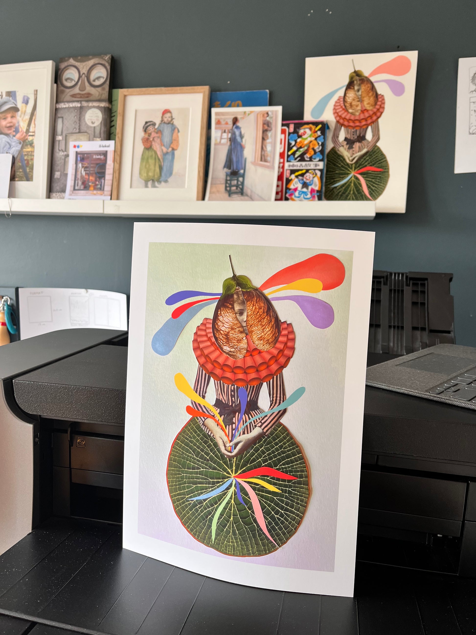 Fiffig montasje, motiv av papircollage, beaibeidet digitalt.