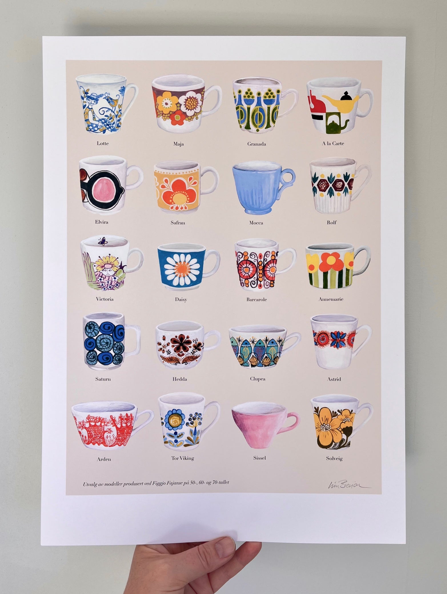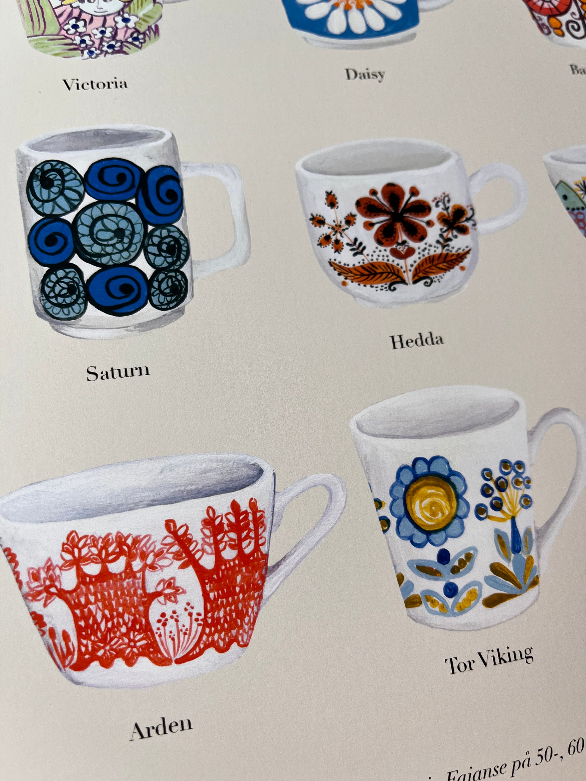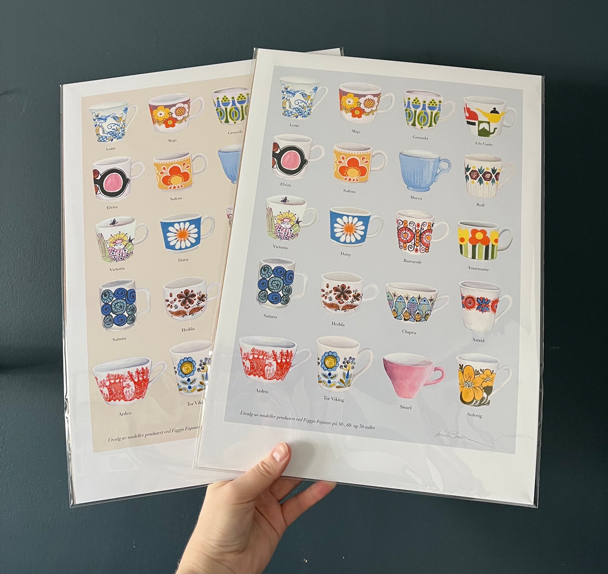 En liten hyllest til noen av de flotte og varierte motivene som har prydet porselen fra Figgjo Fajanse gjennom tidene! Dette er bare et lite utvalg av hva som har blitt produsert. Alle koppene er illustrasjoner malt med akrylmaling og scannet inn, før digital bearbeiding.