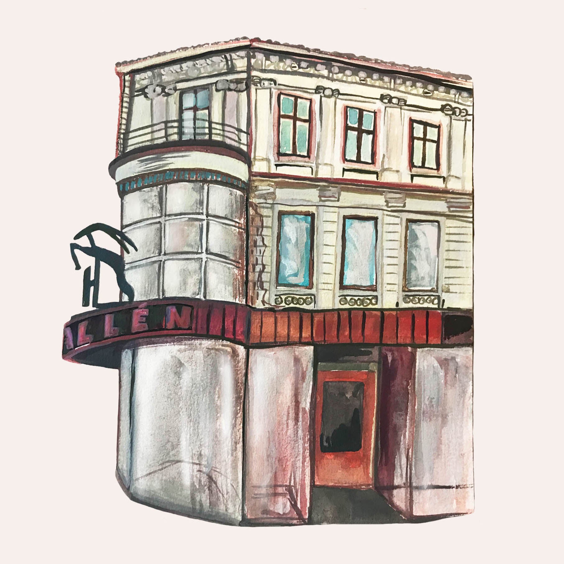 Halléngården på Grünerløkka malt med gouache, scannet inn og lagt på digitalt farget bakgrunn. Kommer med en hvit kant rundt motivet.
