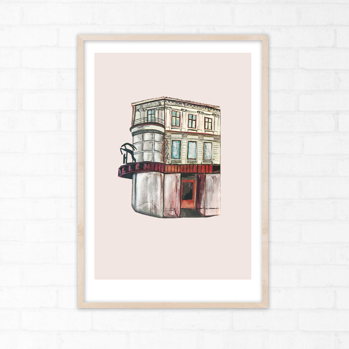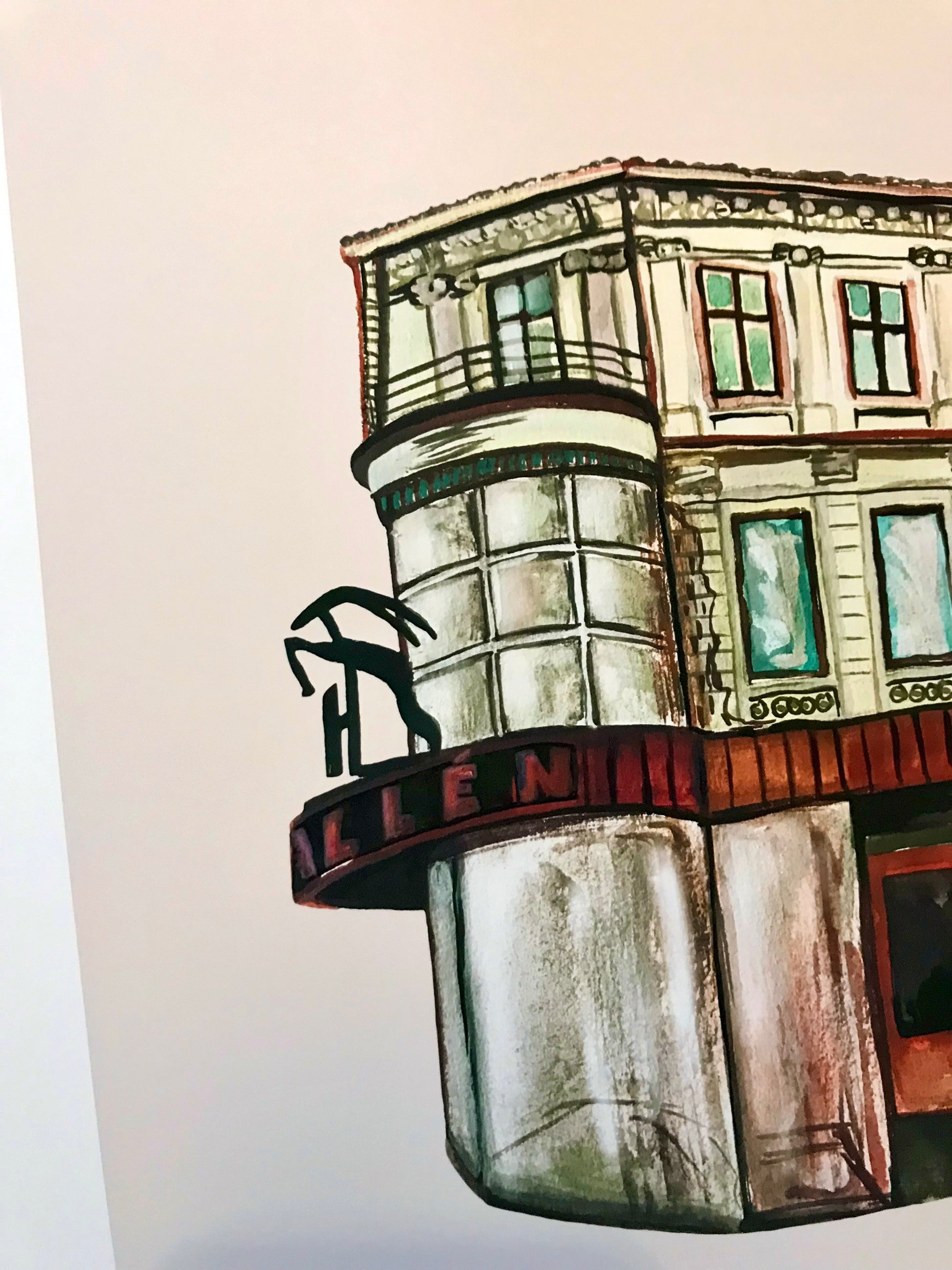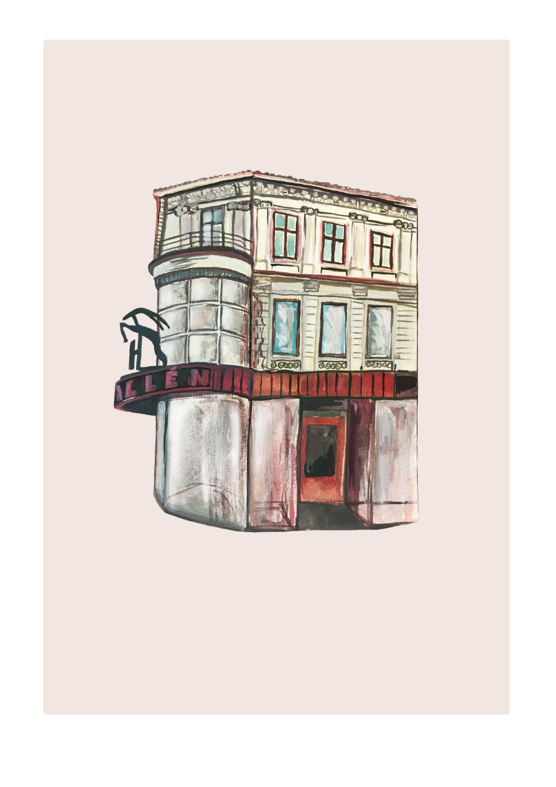 Halléngården på Grünerløkka malt med gouache, scannet inn og lagt på digitalt farget bakgrunn. Kommer med en hvit kant rundt motivet.