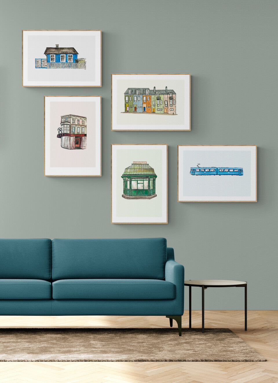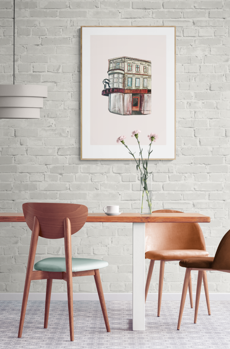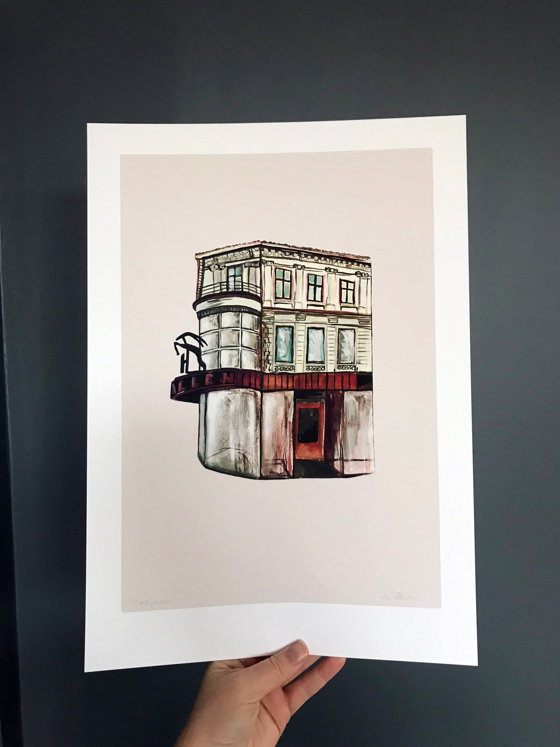 Halléngården på Grünerløkka malt med gouache, scannet inn og lagt på digitalt farget bakgrunn. Kommer med en hvit kant rundt motivet.