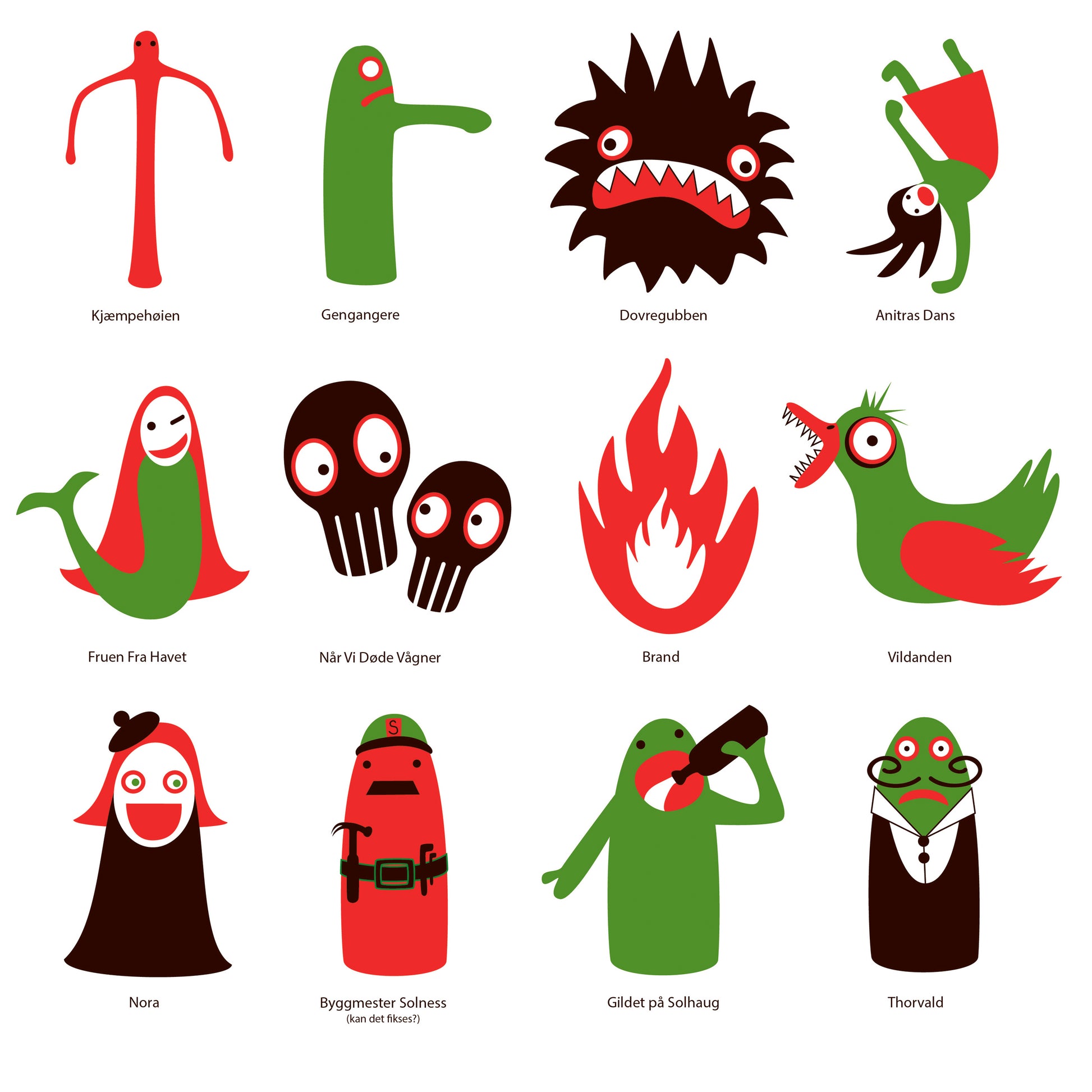 Digital vektorillustrasjon. Trykk med et mylder av figurer fra Ibsens verden. Under står navnet på karakteren eller stykket som ofte er misforstått med vilje.