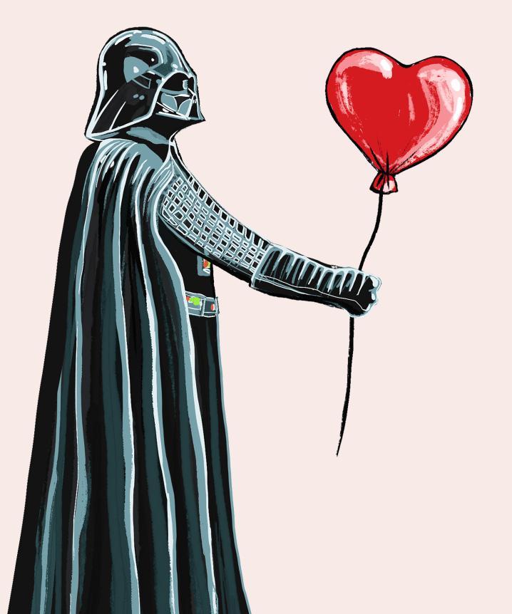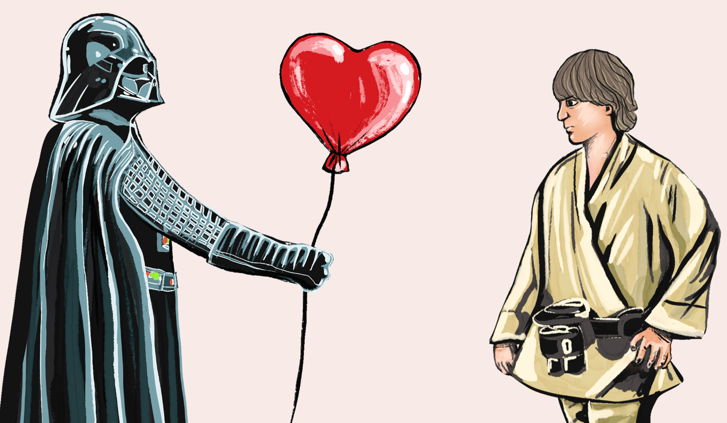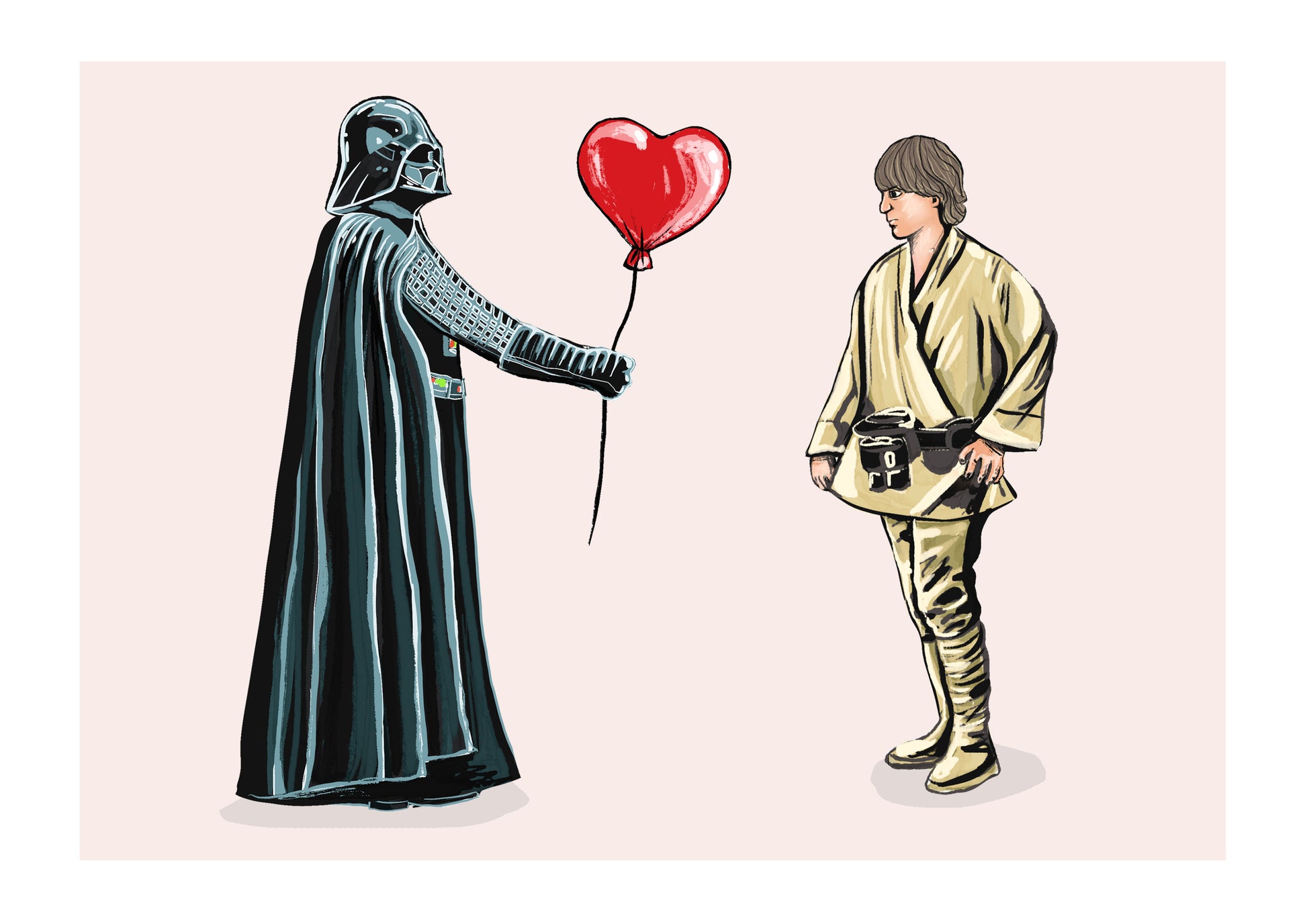 Digital illustrasjon av Darth Vader og Luke Skywalker, svak rosa bakgrunn.