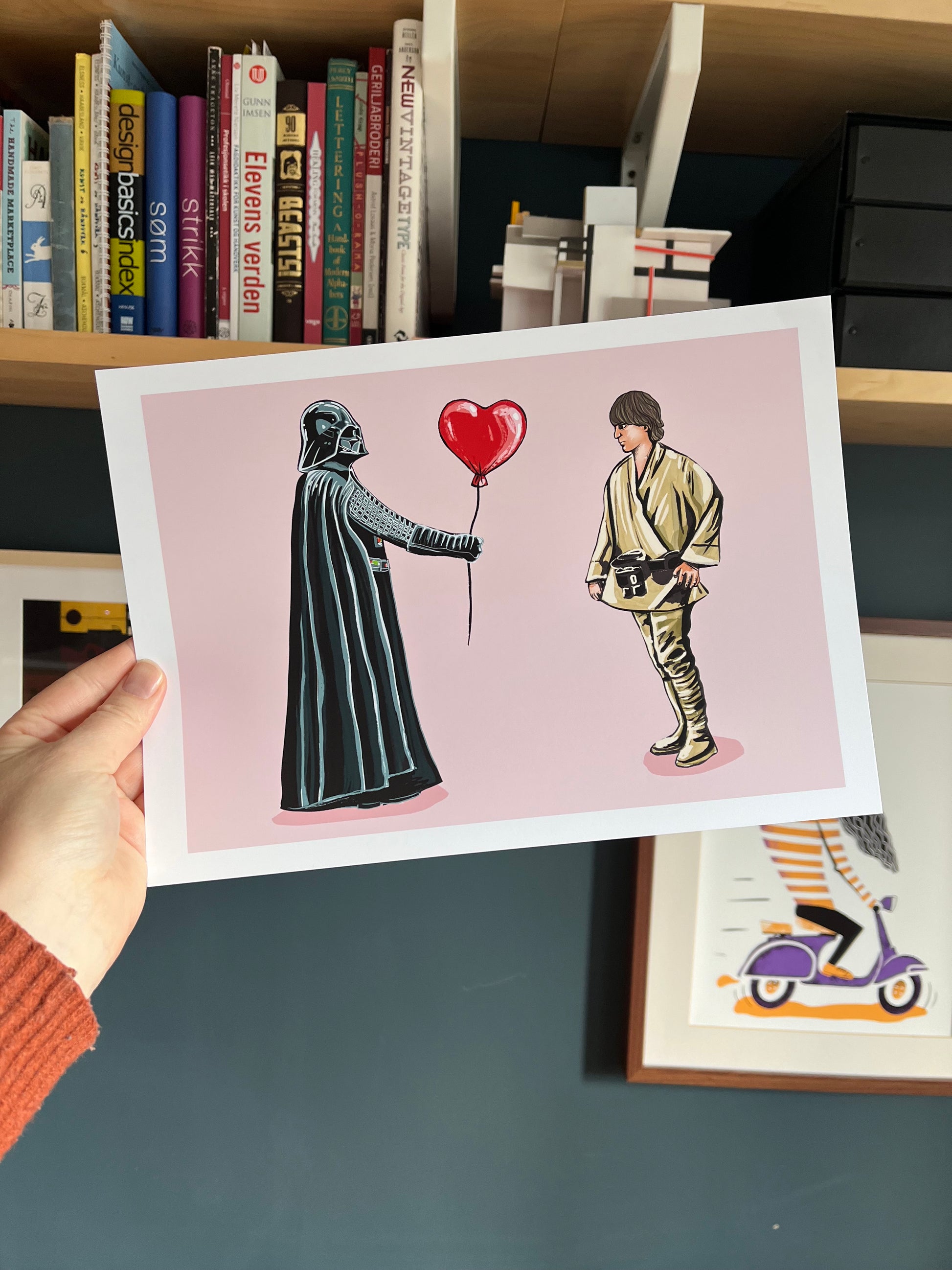 Digital illustrasjon av Darth Vader og Luke Skywalker, svak gråblå bakgrunn.