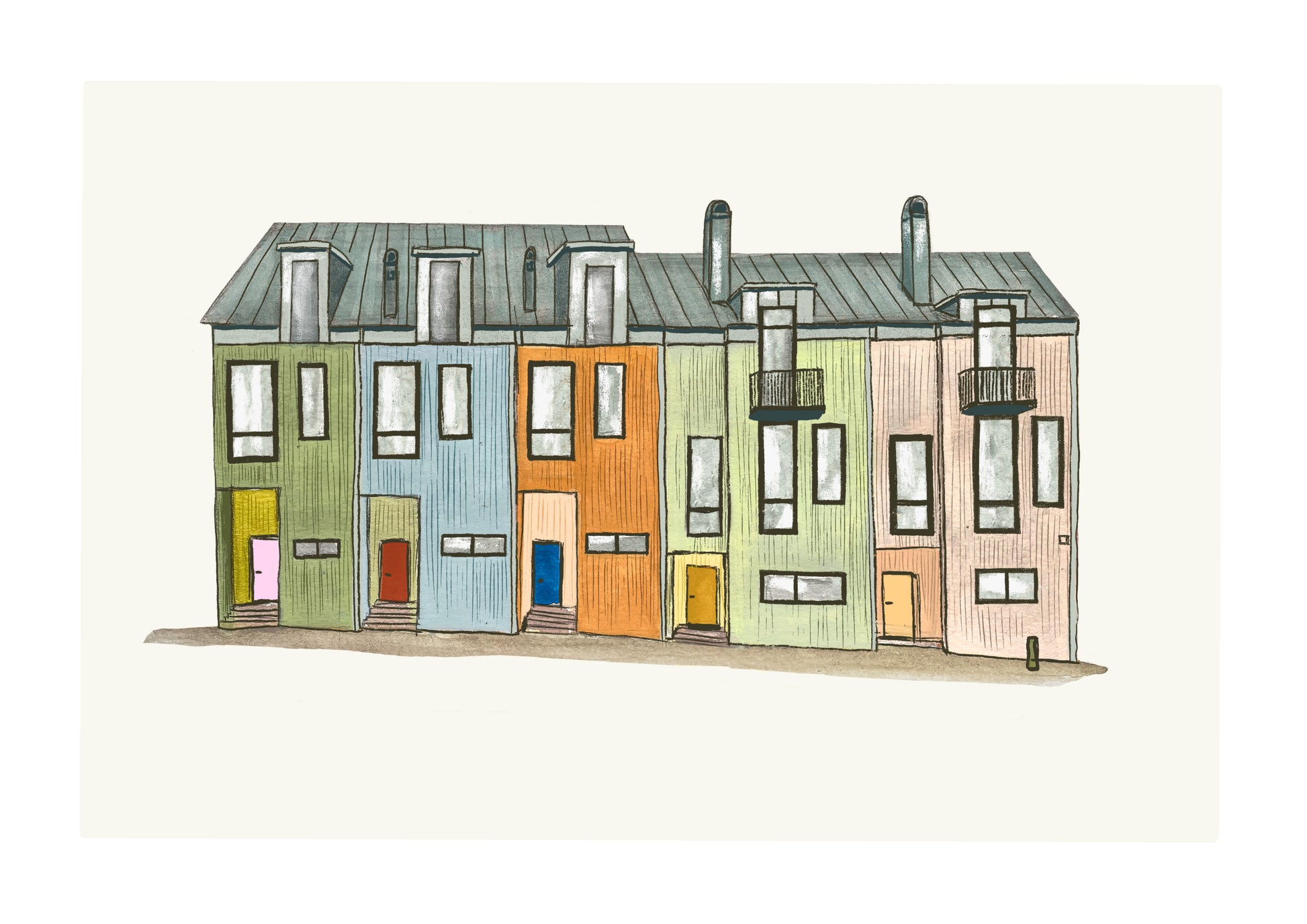 Da de nye rekkehusene ble bygget var fasaden malt beige, bygget ble stadig utsatt for tagging, og det lå som en fargeløs kloss i bybildet. Koi fargestudio ble hyret inn for å løse utfordringene, og utviklet et nytt fargekonsept basert på historiske farger i bydelen. Resultatet er et ypperlig eksempel på hva farger kan tilføre av liv, estetikk, personlighet og identitet.