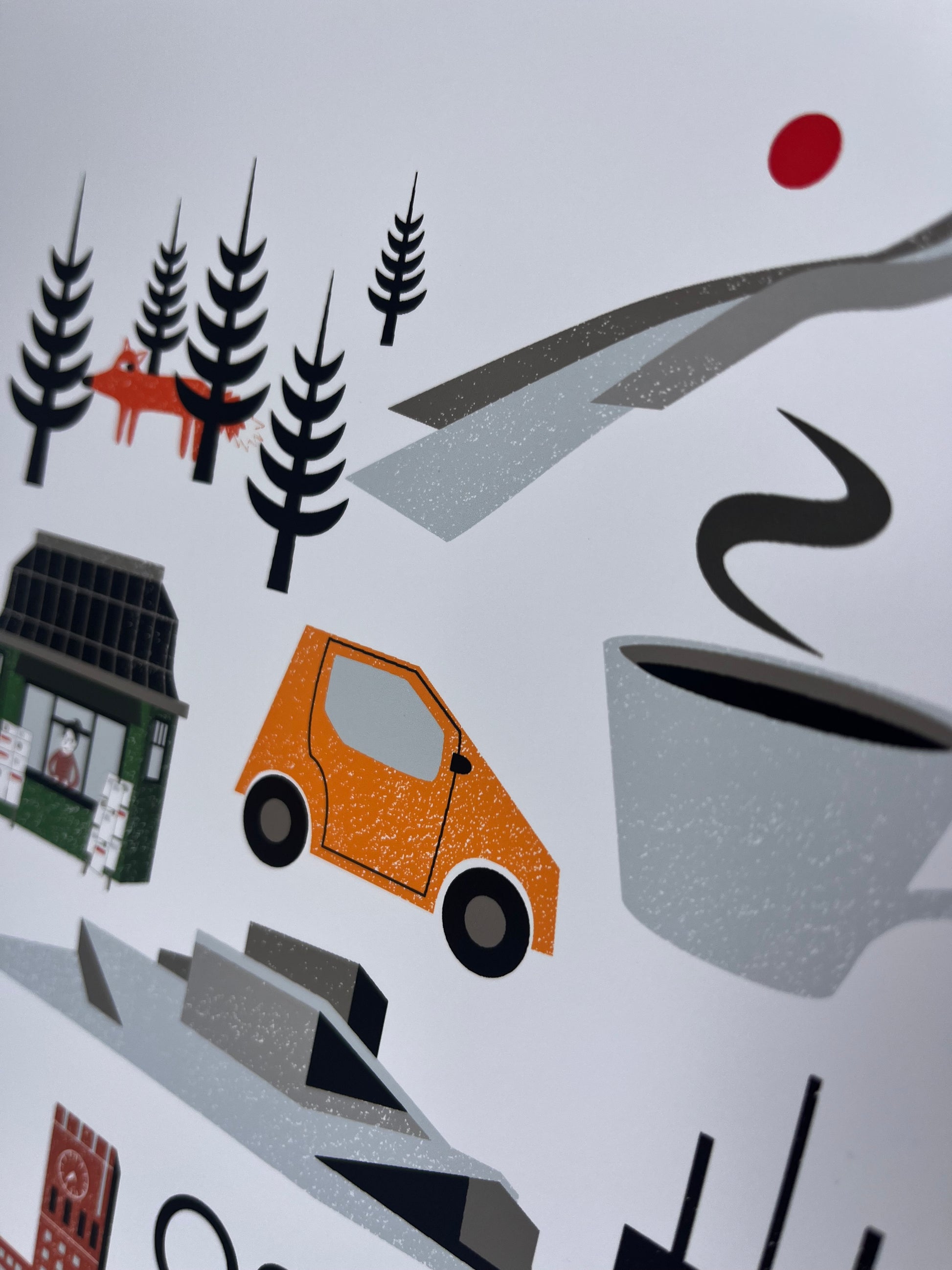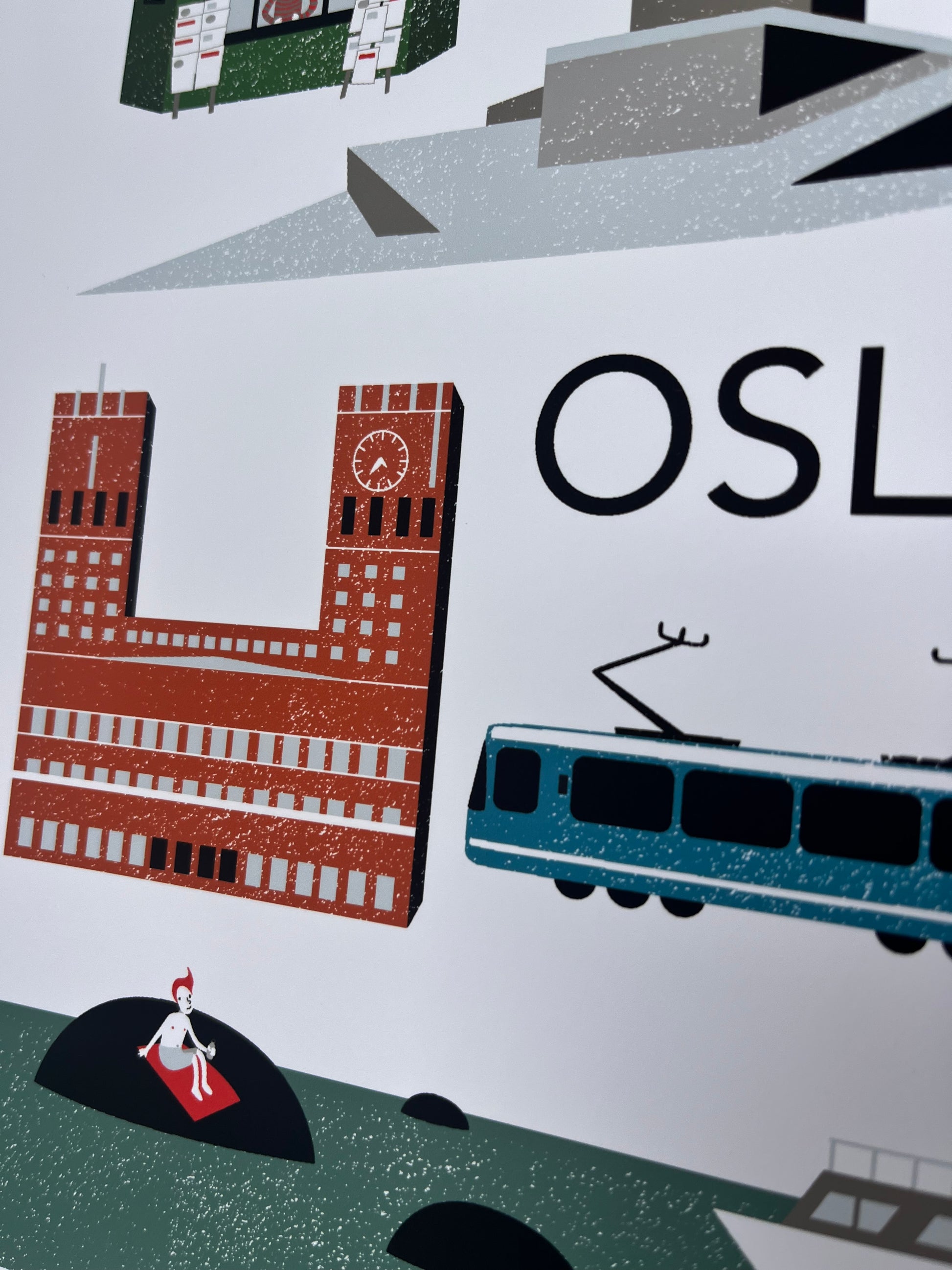 Trykk med motiver fra Oslo: marka, Holmenkollen, aviskiosk fra Karl Johan, liten elbil, kaffekopp, trikken, Trafikanten-tårnet, Rådhuset og båten ut til øyene.