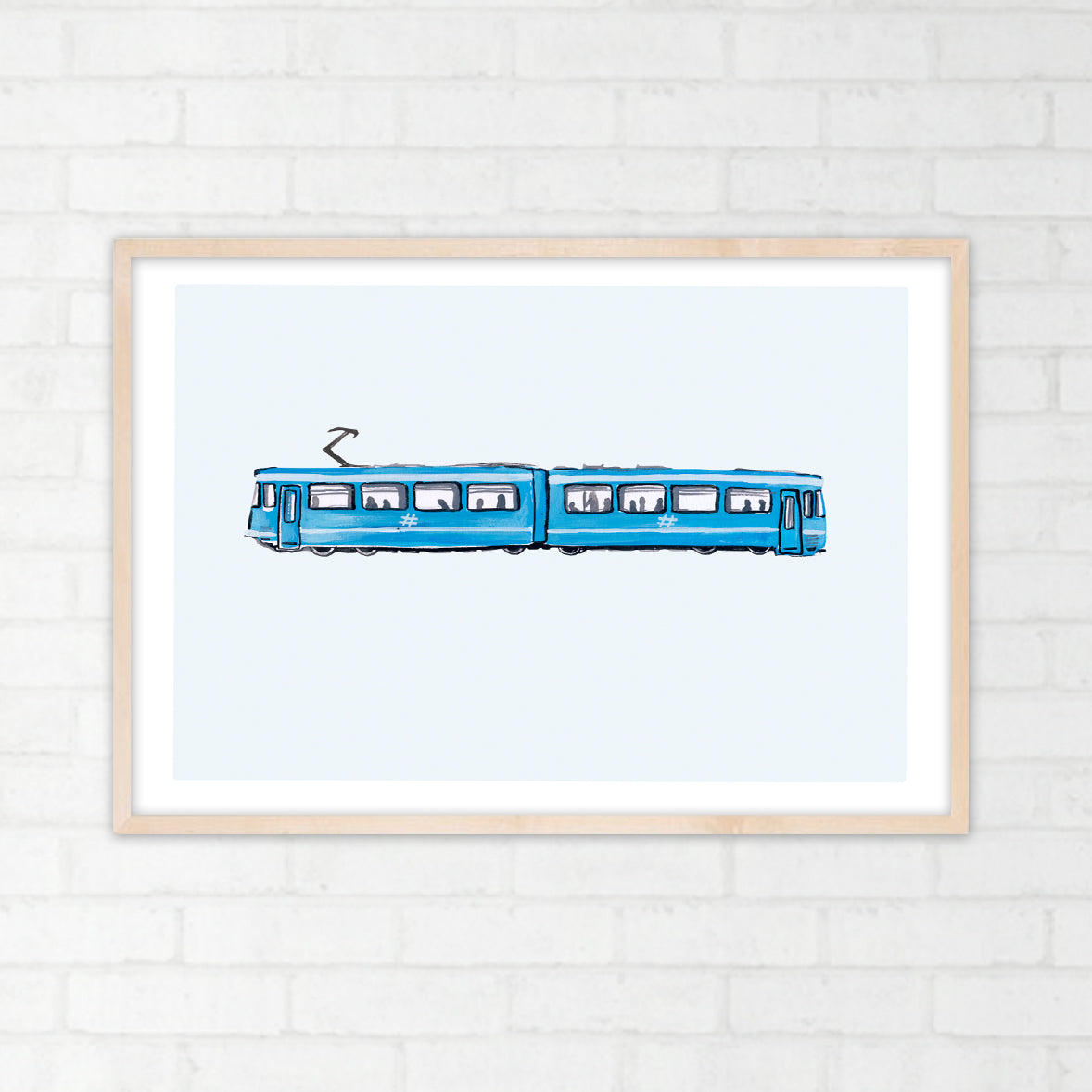 Oslo-trikken malt med gouache, scannet inn og lagt på digitalt farget bakgrunn. Kommer med en hvit kant rundt motivet.