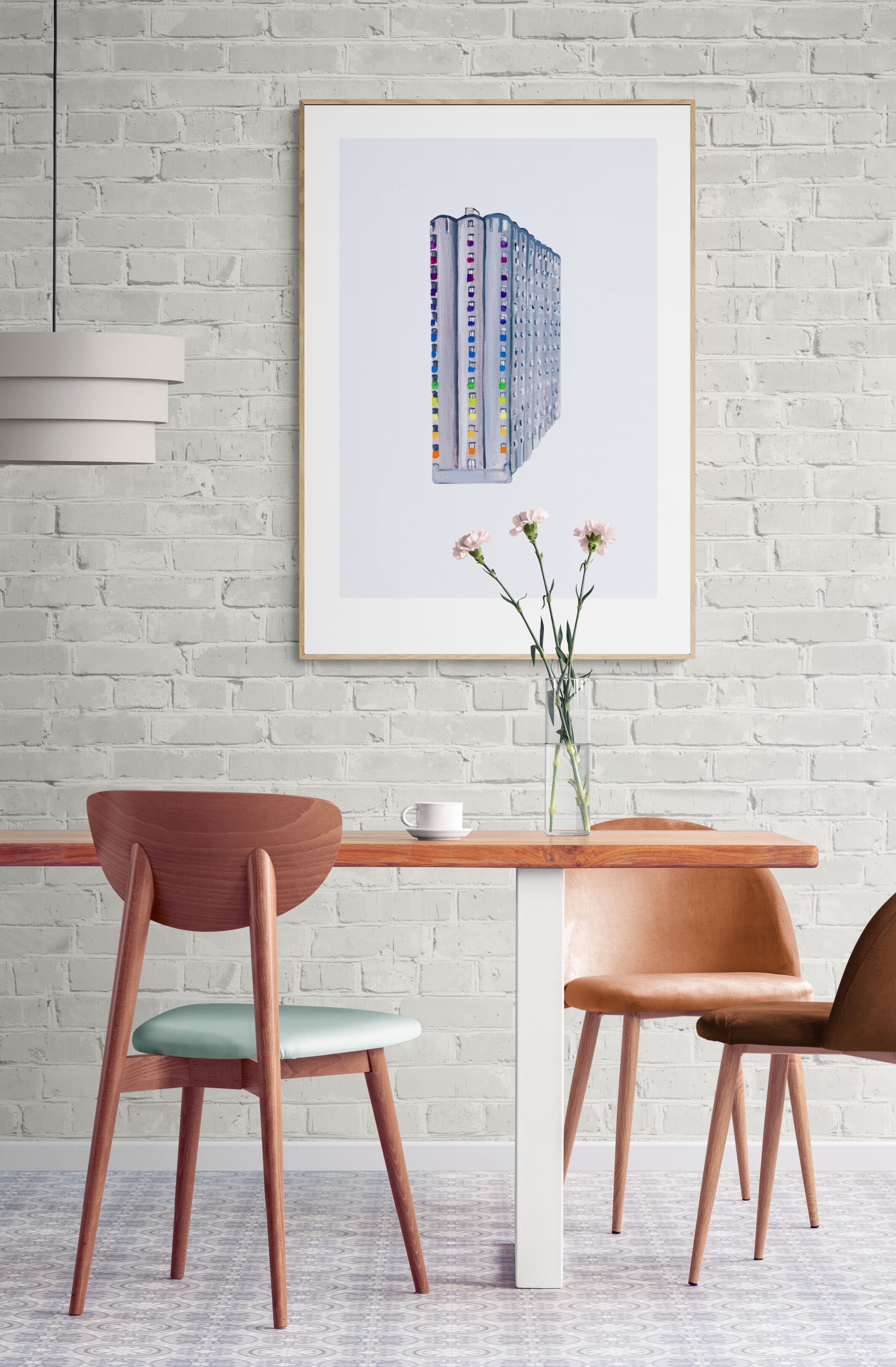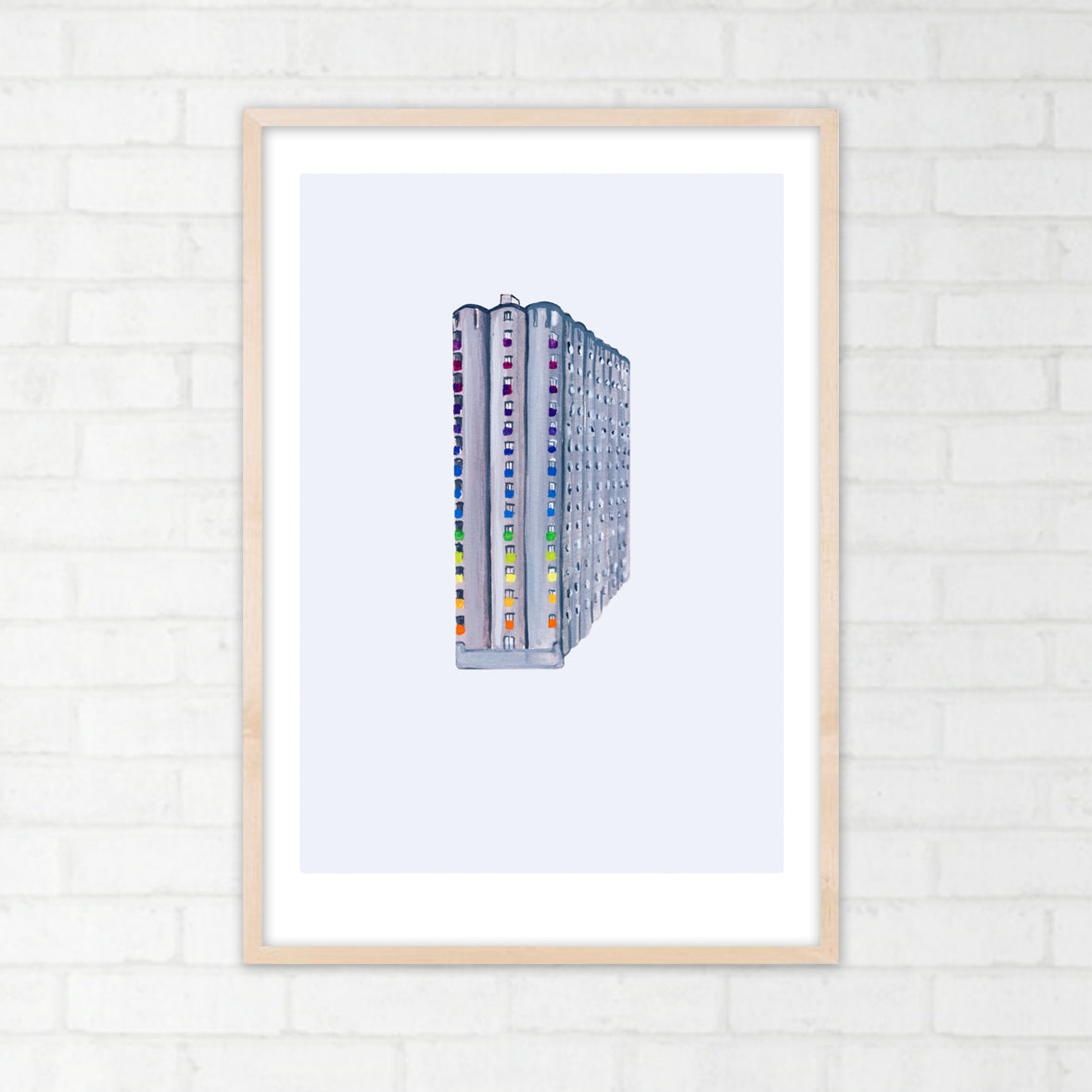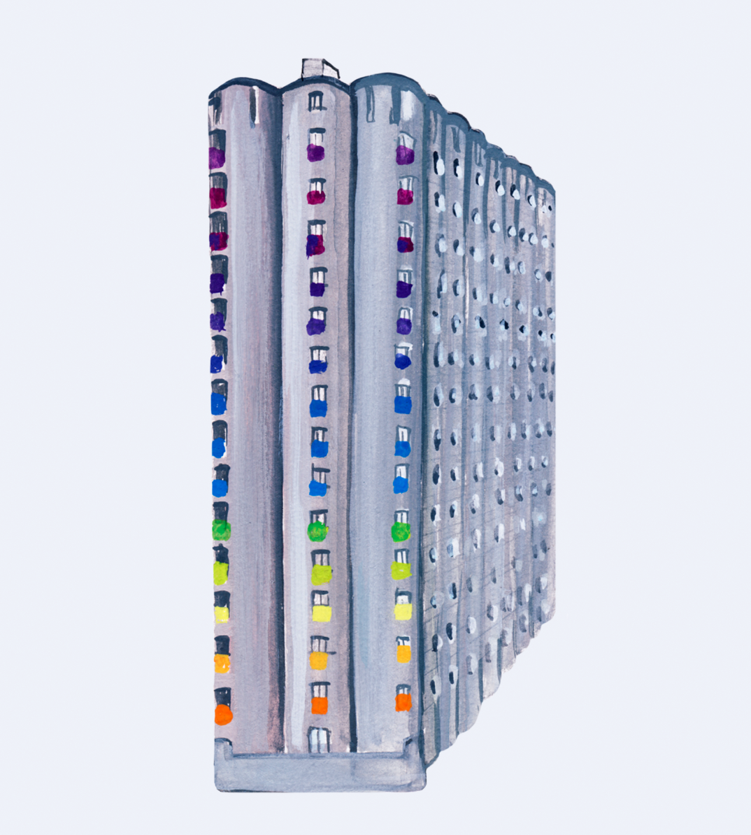 Siloen på Grünerløkka malt med gouache, scannet inn og lagt på digitalt farget bakgrunn. Kommer med en hvit kant rundt motivet.