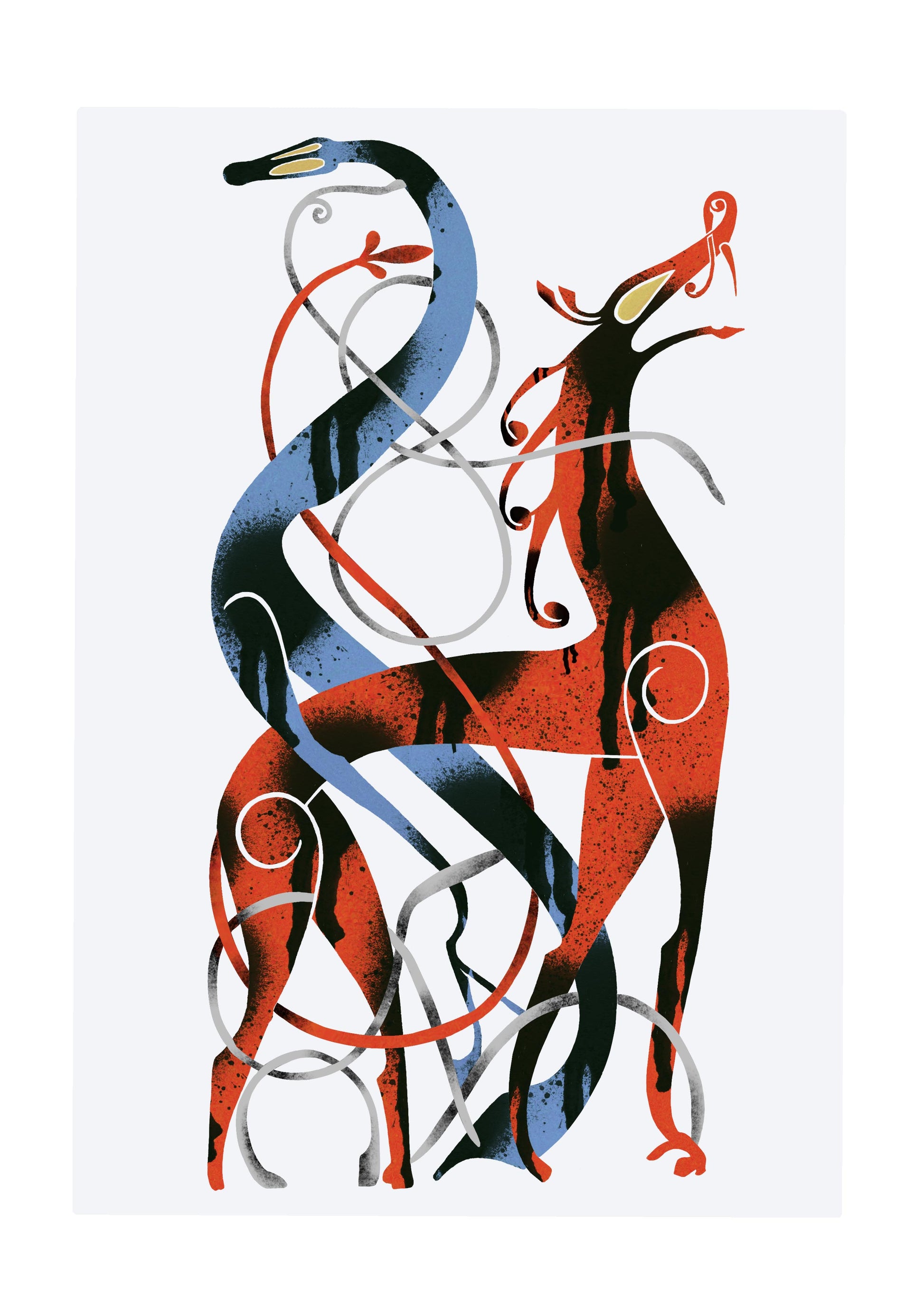 Illustrasjon basert på deler av dyreornamentikken som omkranser inngangsportalen på Urnes stavkirke, bygd rundt 1130-1140.