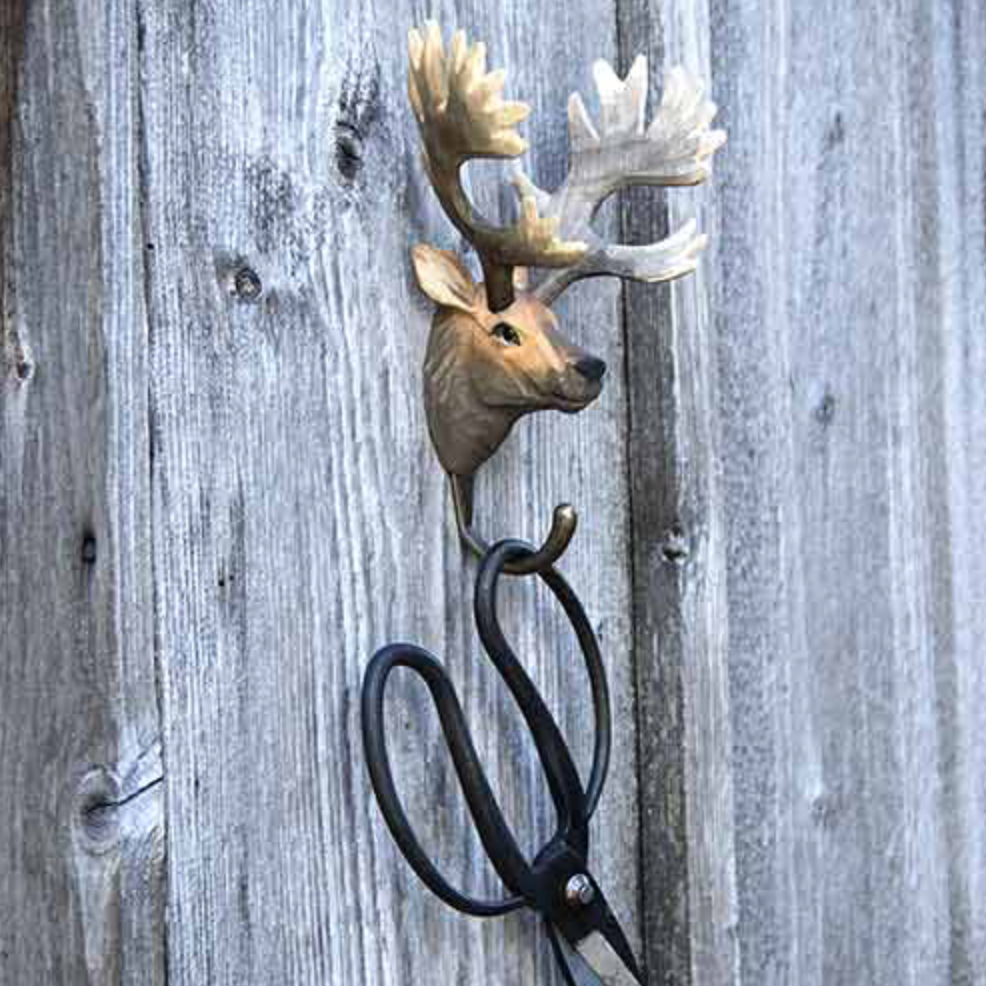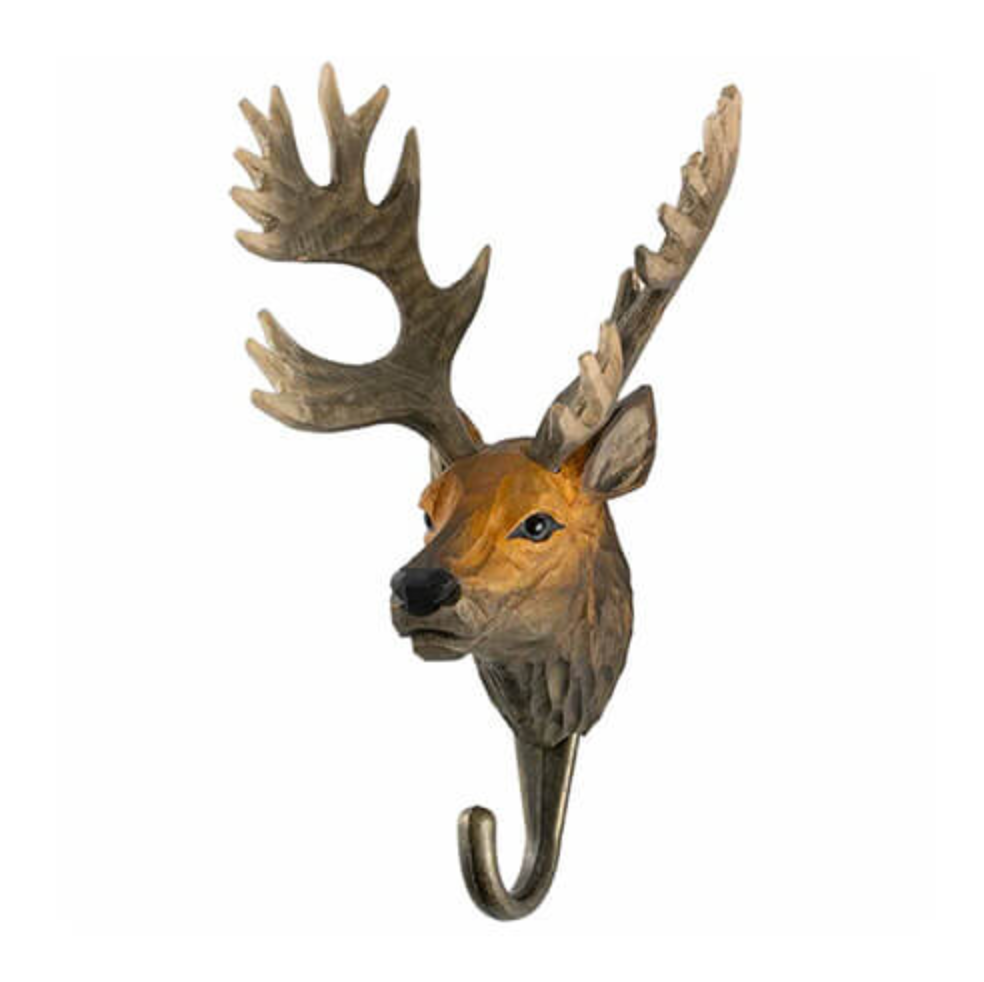 Krok med kronhjort, håndskåret av lindetre, håndmalt i miljøvennlige farger. Krok i bronsefarget metall.