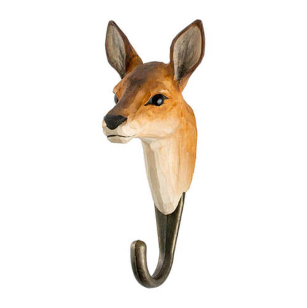 Krok med rådyr, håndskåret av lindetre, håndmalt i miljøvennlige farger. Krok i bronsefarget metall.